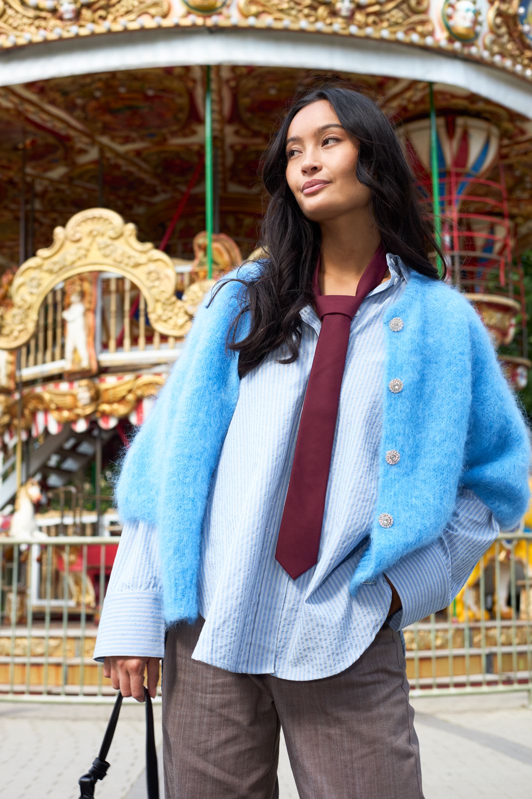 Vaaleanpunainen neuletakki tuo pehmeyttä asukokonaisuuteen. Se sopii erityisen hyvin kevään ja kesän vaaleisiin sävyihin, mutta toimii myös syksyllä tummempien värien rinnalla.