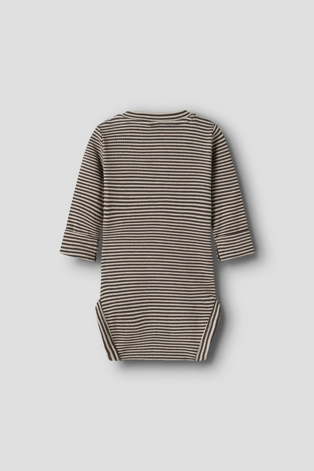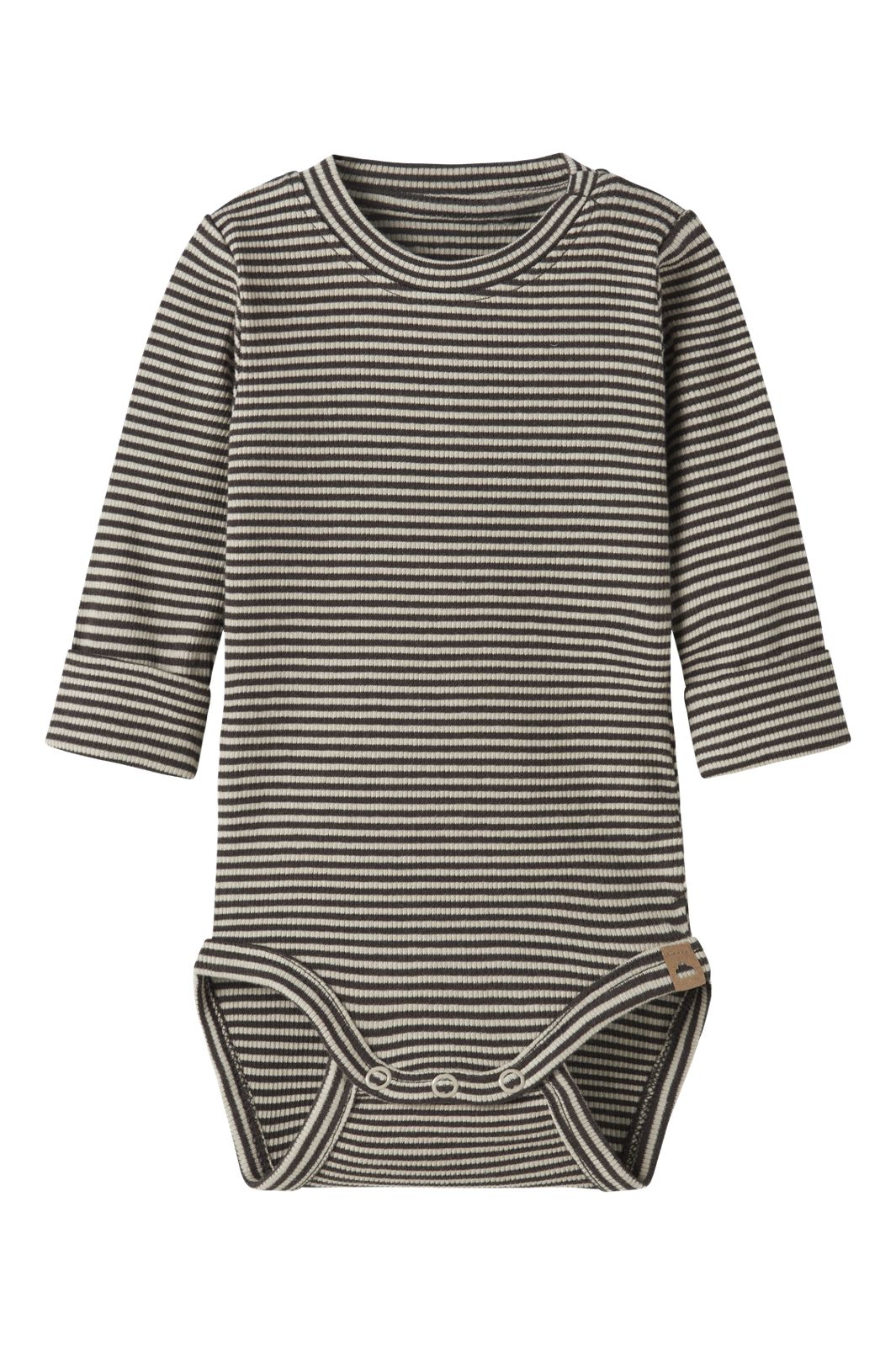 Punainen body Name Itiltä pehmeästä jersey-kankaasta joulukuusimotiivilla ja tekstillä Ensimmäinen jouluni. Bodyn hihat ovat pitkät ja olkapäällä on napit, jotka helpottavat pukemista ja riisumista.