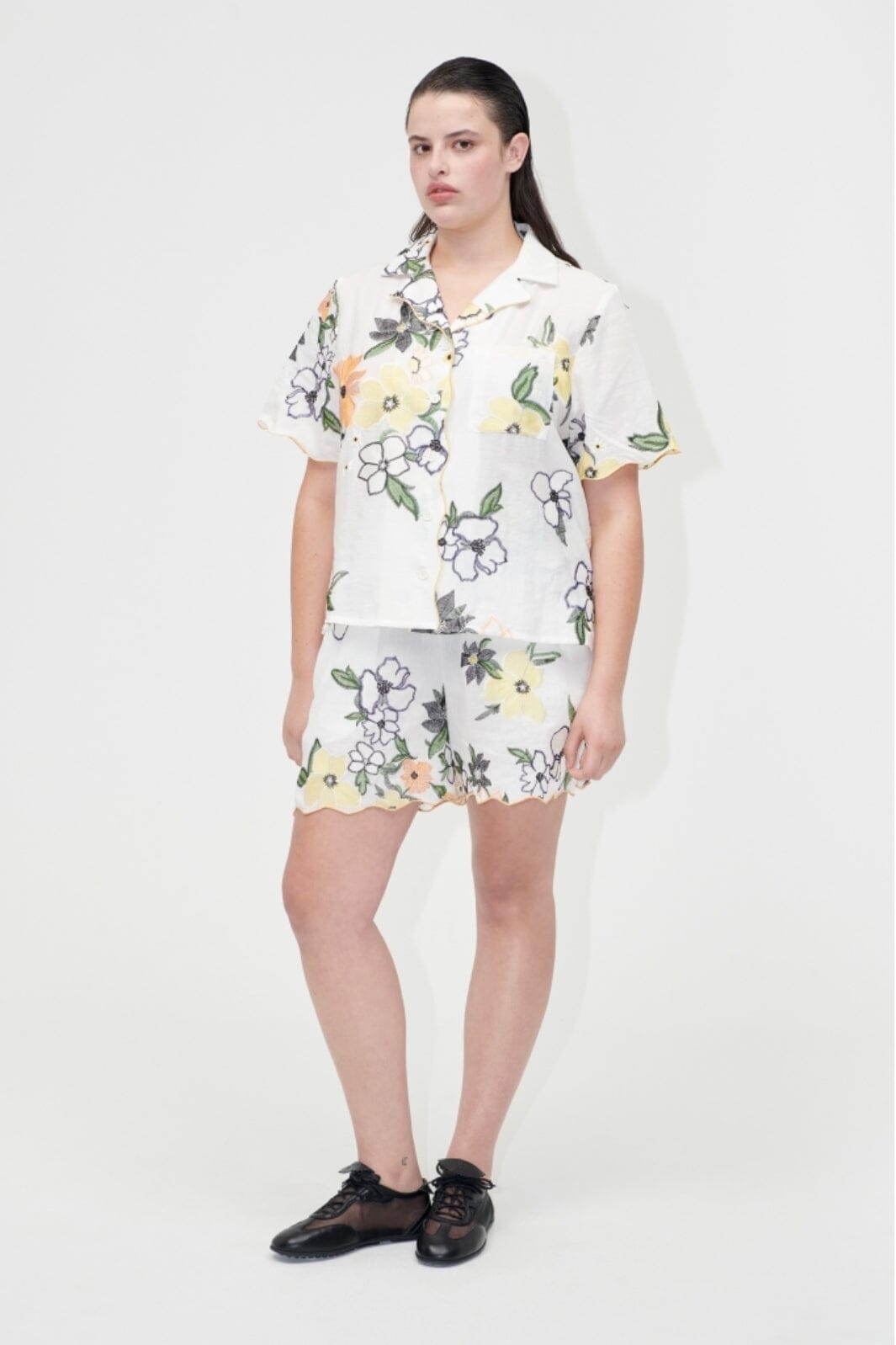 Valkoiset shortsit Stine Goyalta, joissa on brodeerattuja kukkia keltaisena, vihreänä ja mustana. Shortseissa on aaltoilevat reunat ja joustava vyötärö, jossa on nauha.