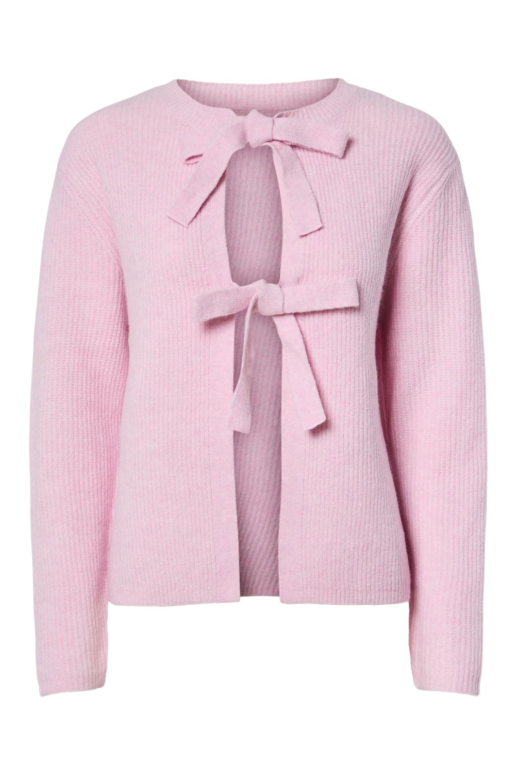 Vaaleanpunainen neuletakki tuo pehmeyttä asukokonaisuuteen. Se sopii erityisen hyvin kevään ja kesän vaaleisiin sävyihin, mutta toimii myös syksyllä tummempien värien rinnalla.