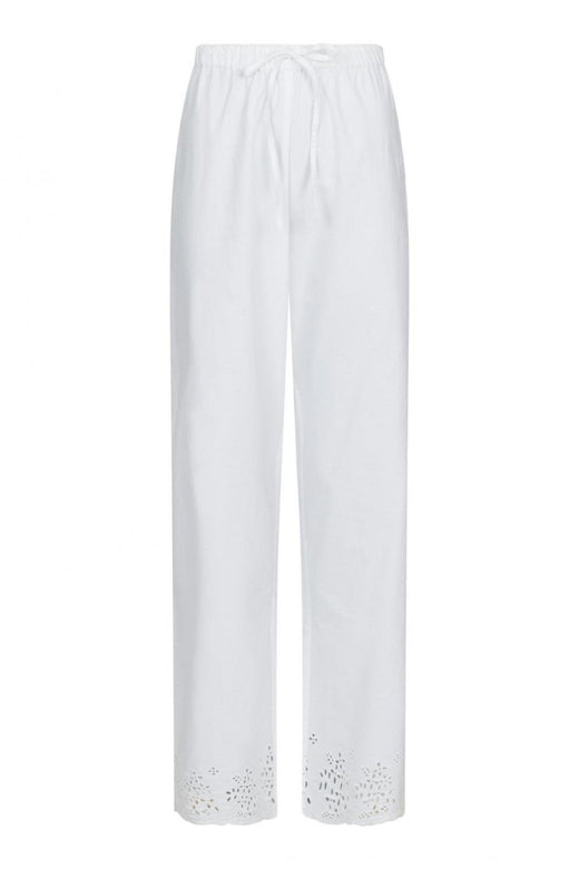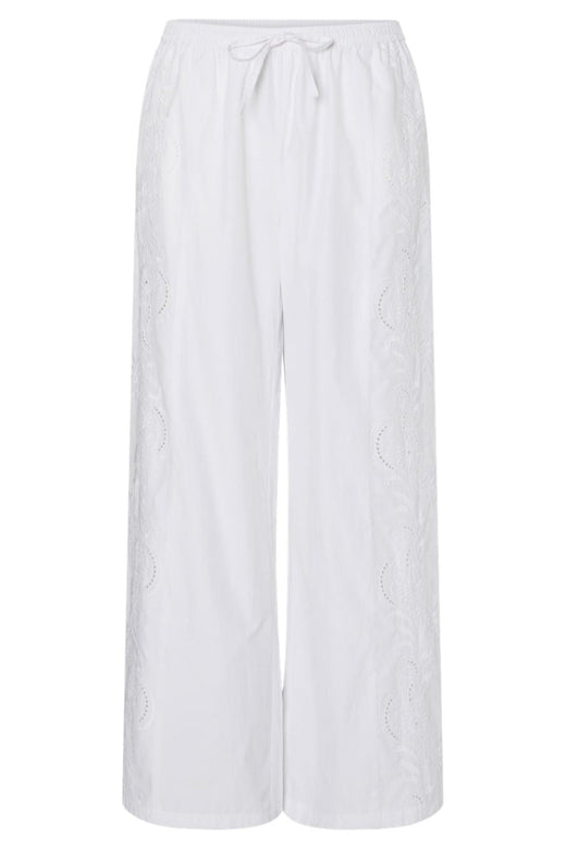 Suoralahkeiset valkoiset housut mukautuvat moniin tilanteisiin. Klassinen leikkaus tekee niistä helppokäyttöiset, ja ne toimivat pohjana niin arkisiin kuin juhlaviin asuihin. Yhdistele eri yläosien kanssa tilanteen mukaan.