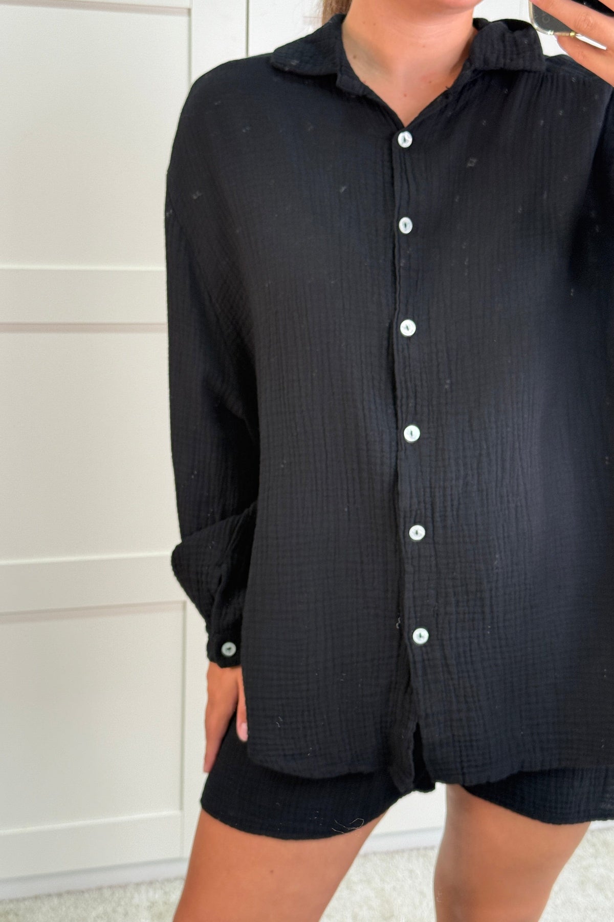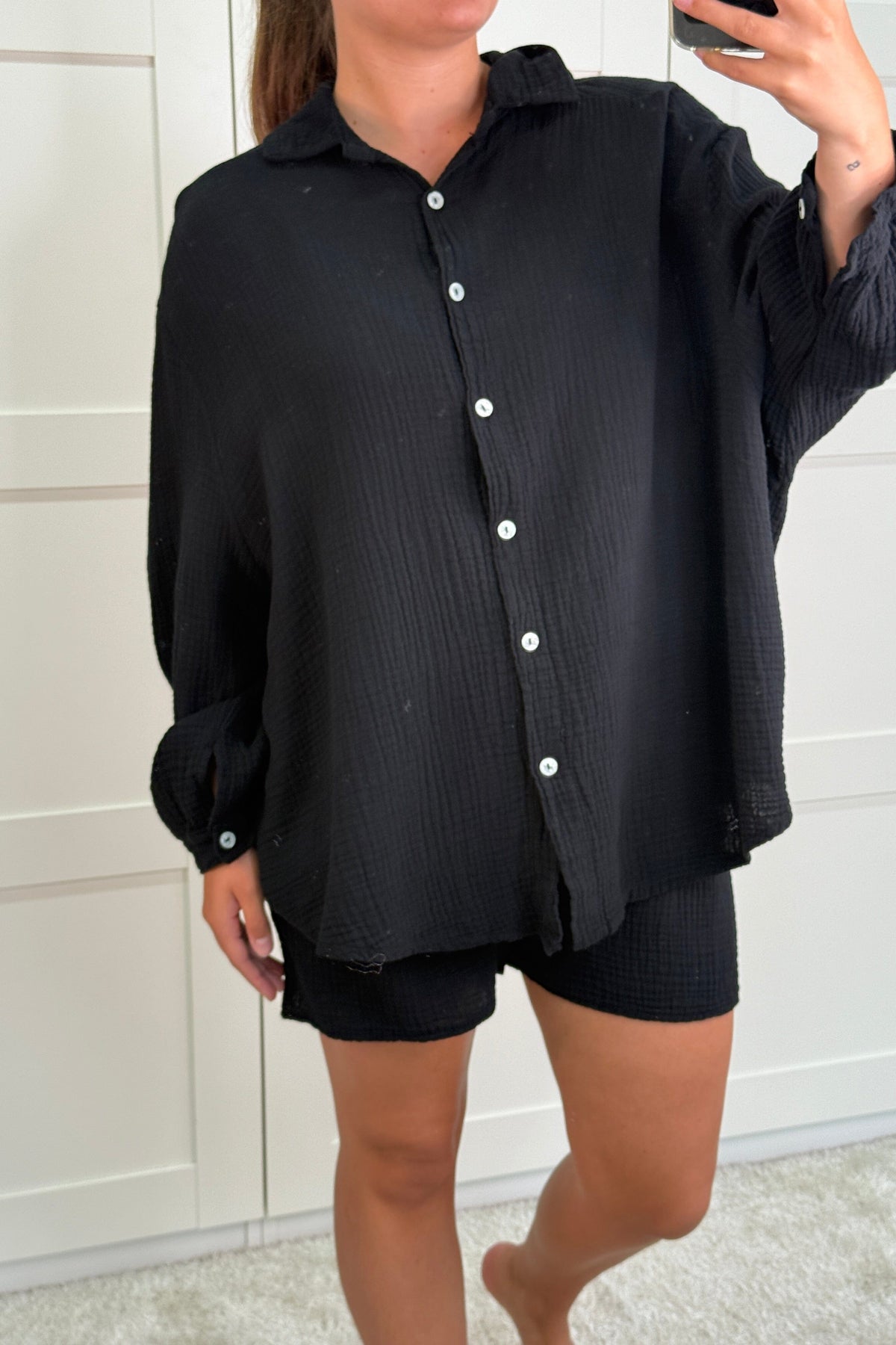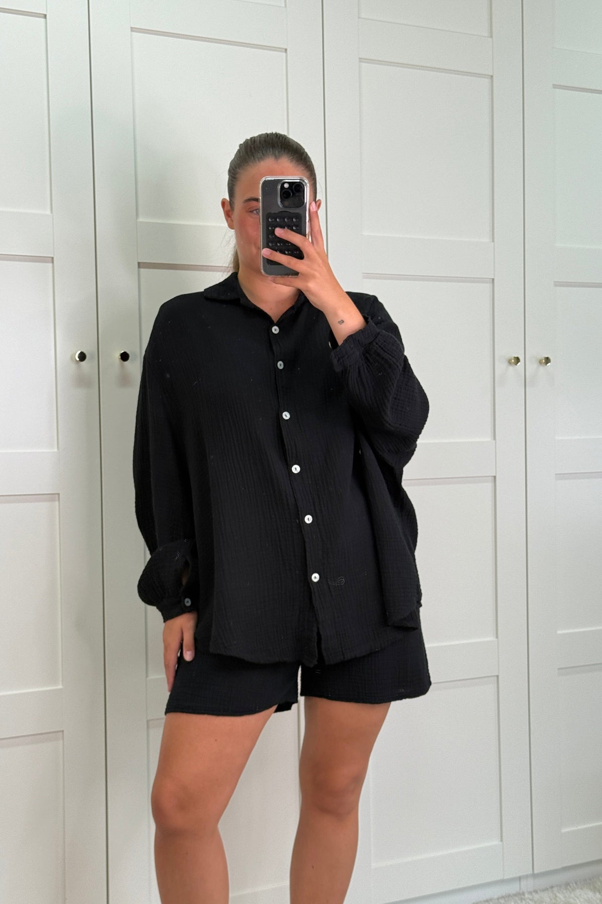 Musta asu A-beeltä kahdessa osassa, jossa on paita ja shortsit. Valmistettu puhtaasta puuvillasta, jossa on napit edessä paidassa ja nauha shortseissa. Asu on rento malli.
