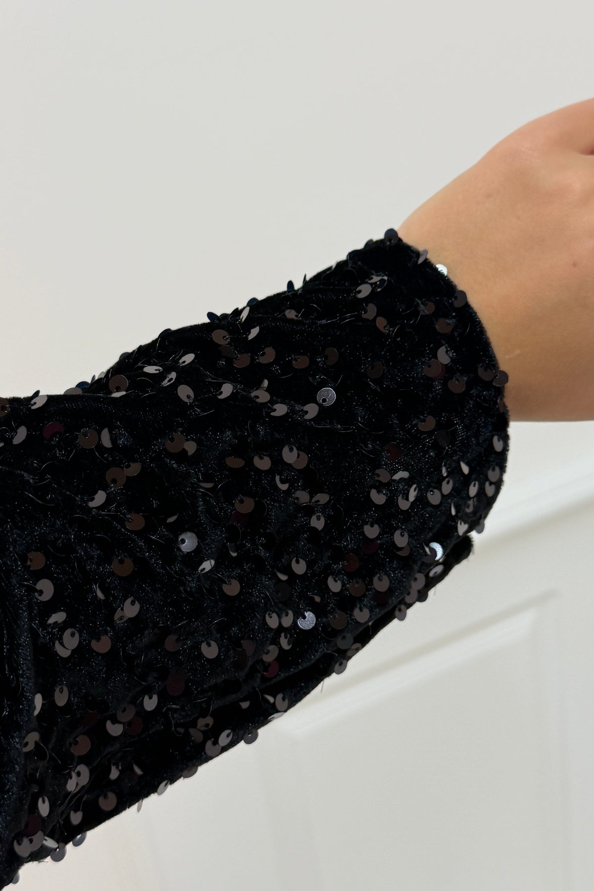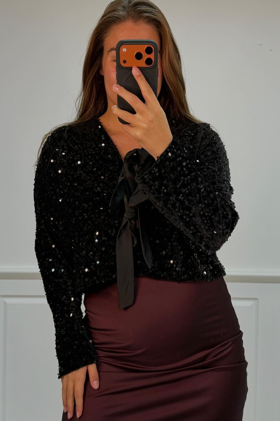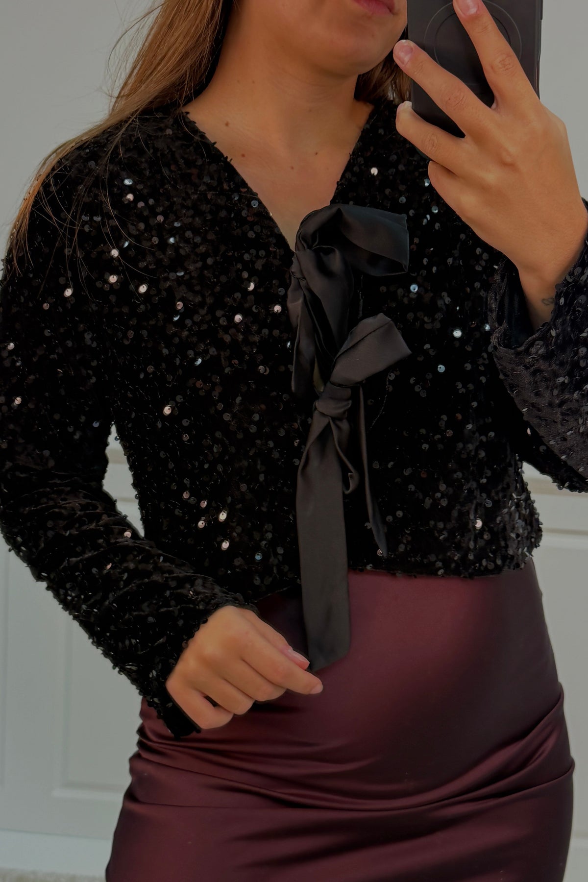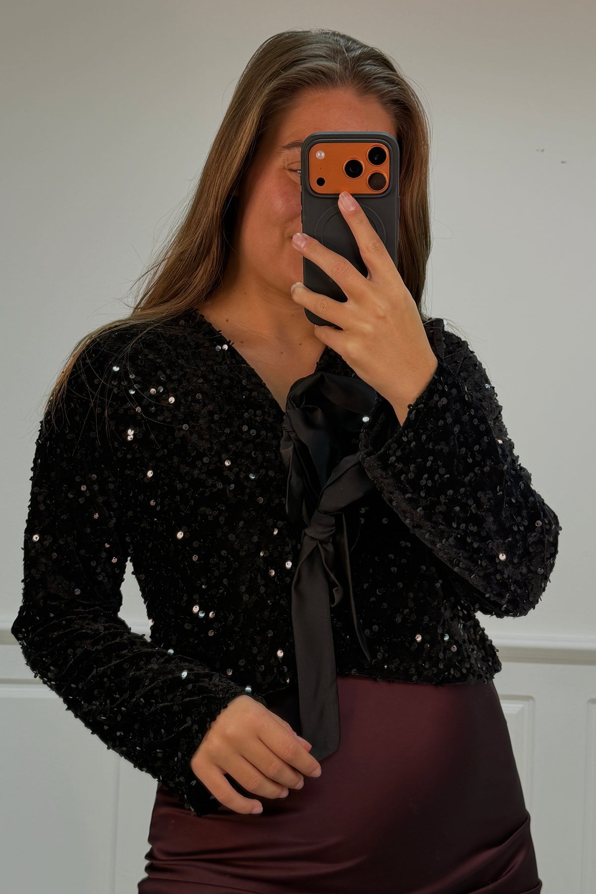 Musta paita A-beeltä, jossa on paljetteja ja nauhadetaileja. Paidassa on V-pääntie nauhakiinnityksellä ja pitkät hihat. Kimaltava pinta ja koristeelliset nauhat tekevät siitä sopivan juhlatilaisuuksiin.