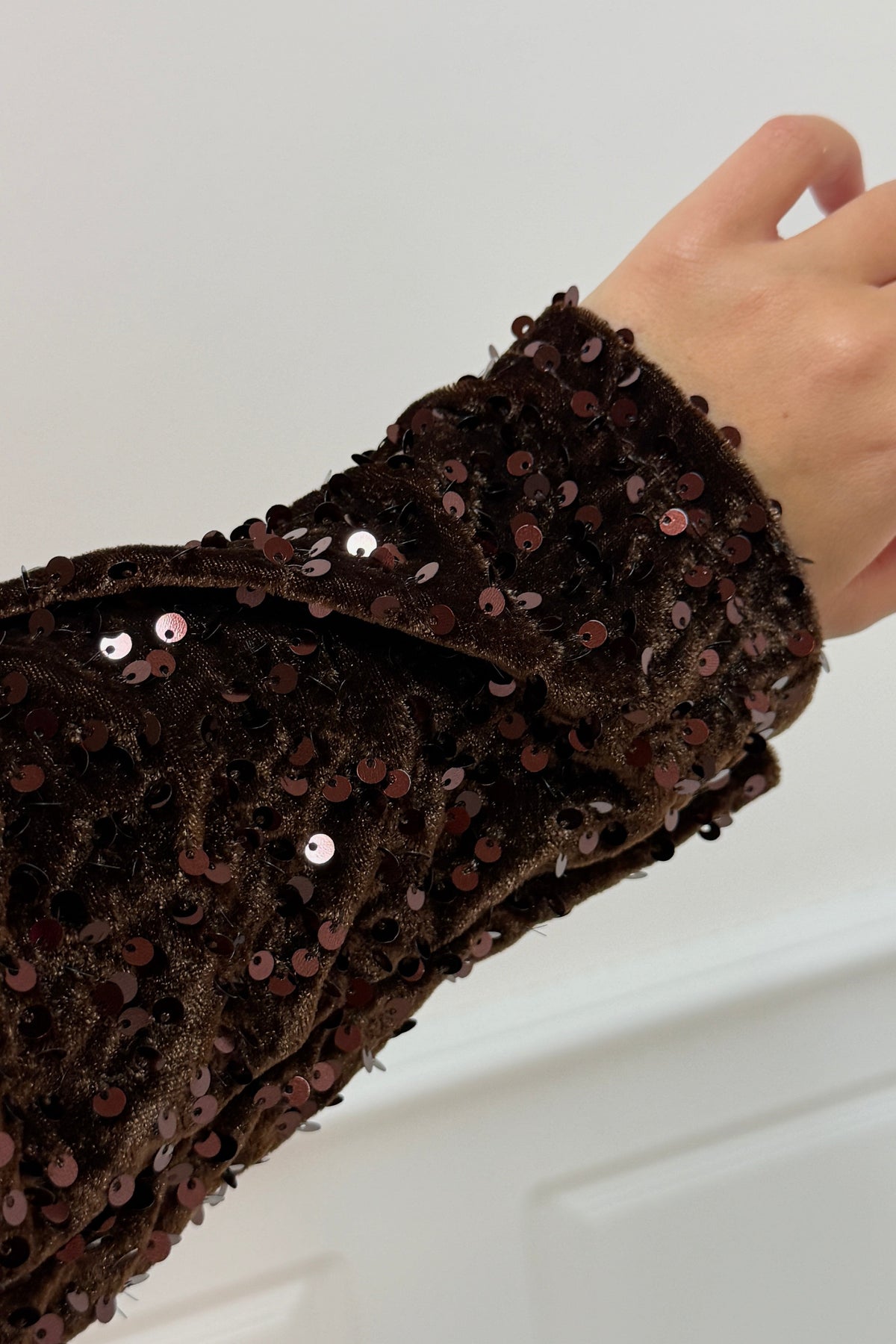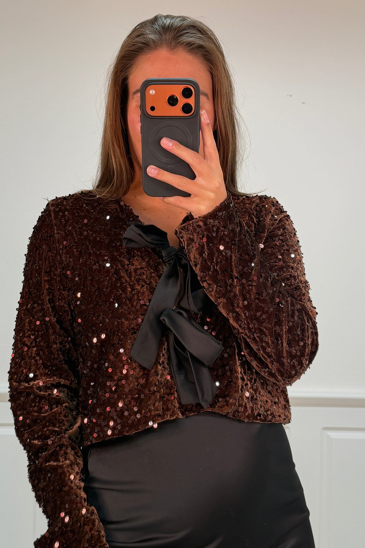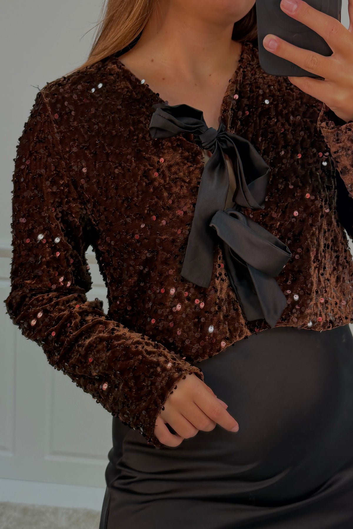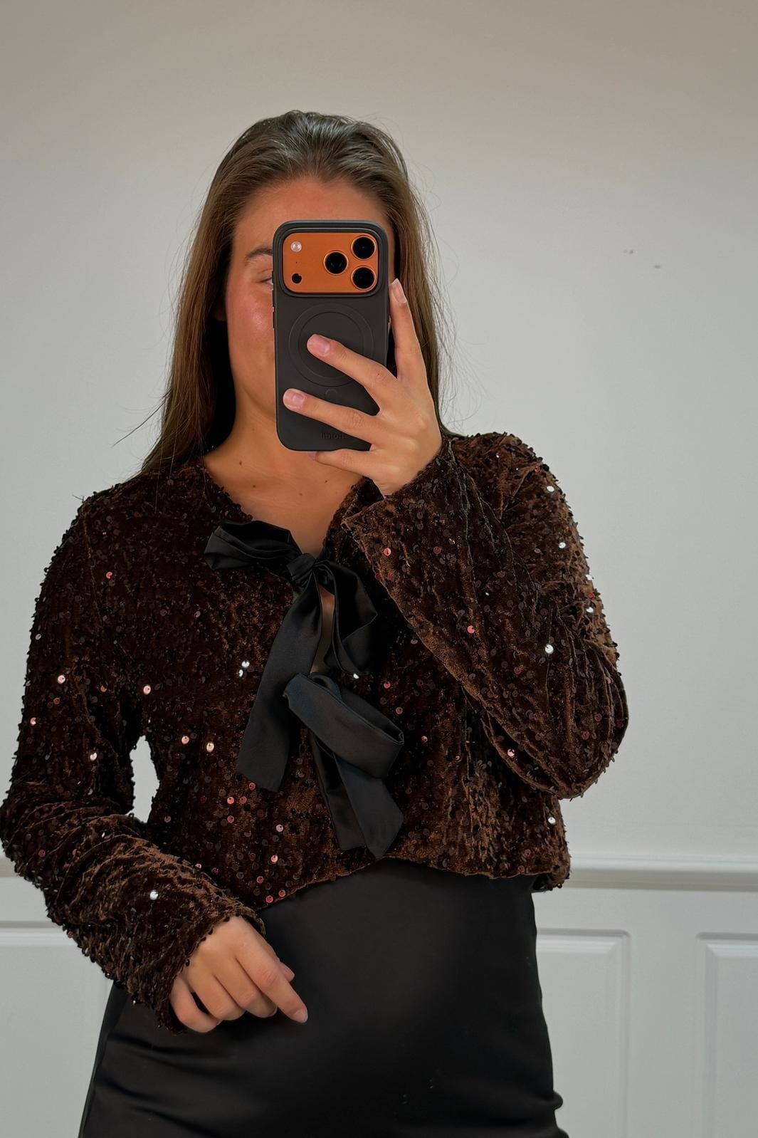 Tumma maroon-paita A-beeltä, jossa on kiiltäviä paljetteja koko pinnalla. Siinä on musta solmu V-aukossa ja pitkät hihat, joissa on löysä istuvuus.