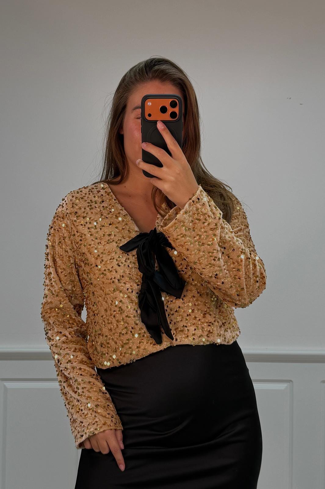 Kultainen pusero A-beeltä, jossa on paljetteja koko pinnalla. Siinä on pitkät hihat, V-pääntie ja mustat nauhakoristeet kaulassa.