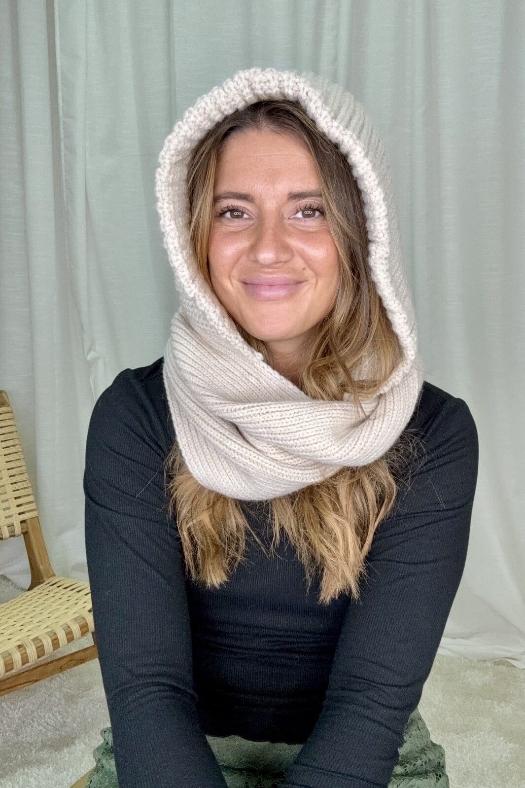 Beige sävy A-bee:ltä ribbikudotulla designilla ja integroitu hupulla. Sitä voidaan käyttää sekä tavallisena myssynä että hupparina, joka tarjoaa lisälämpöä kaulan ja pään ympärillä.