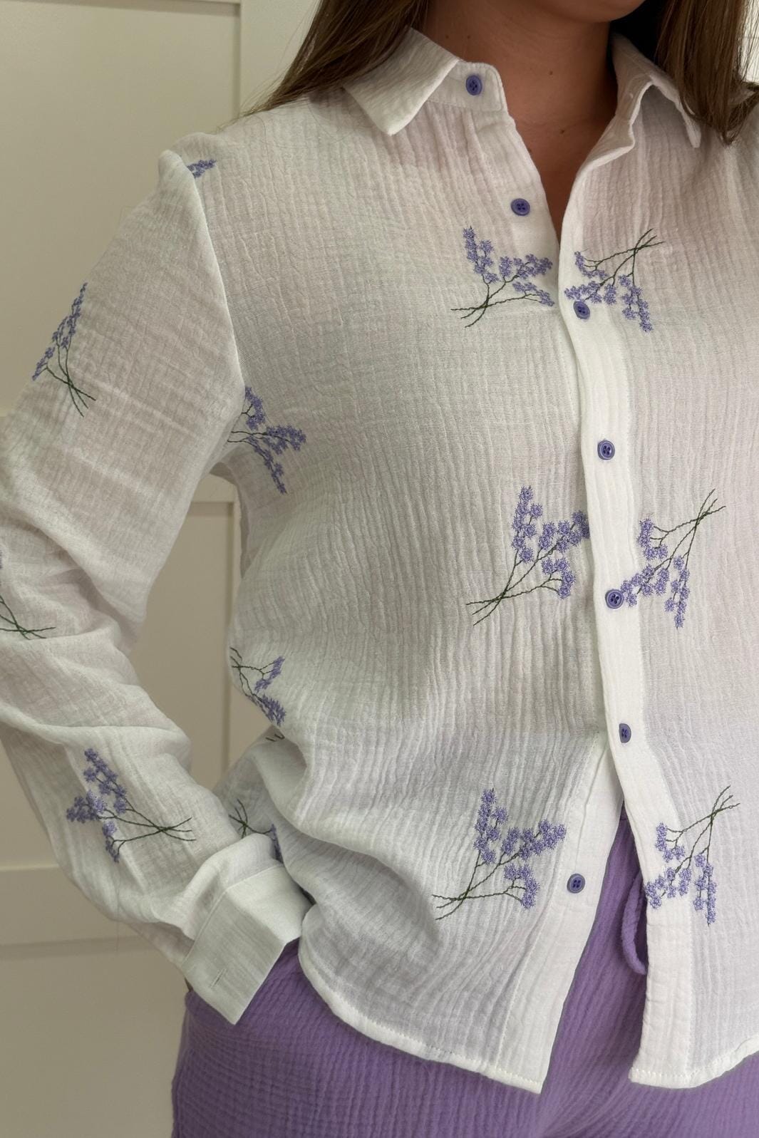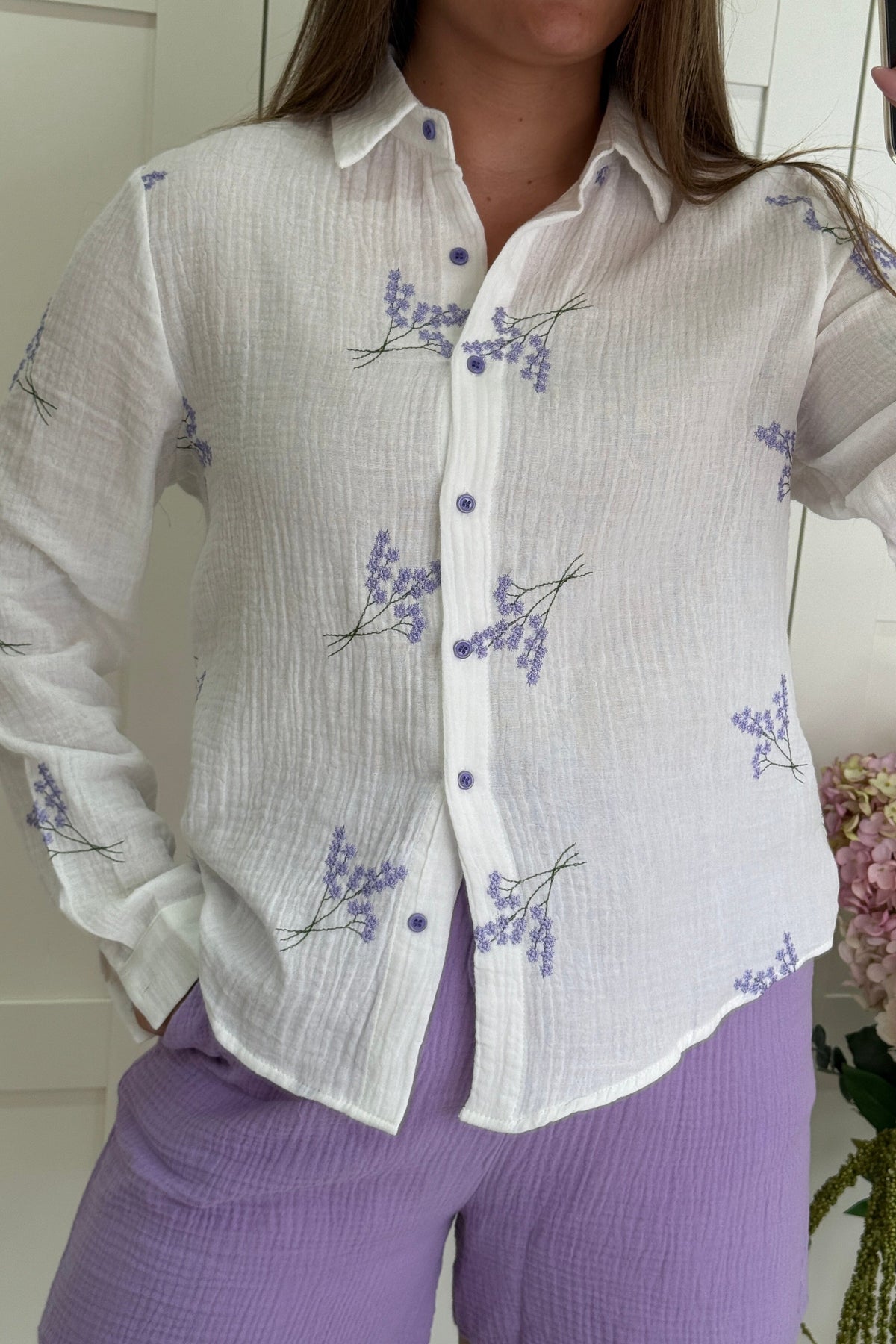 Valkoinen paita A-beeltä, jossa on lilaa kukkakirjontaa. Paidassa on rento malli ja pitkät hihat, joissa on klassinen kaulus ja nappilukitus edessä.