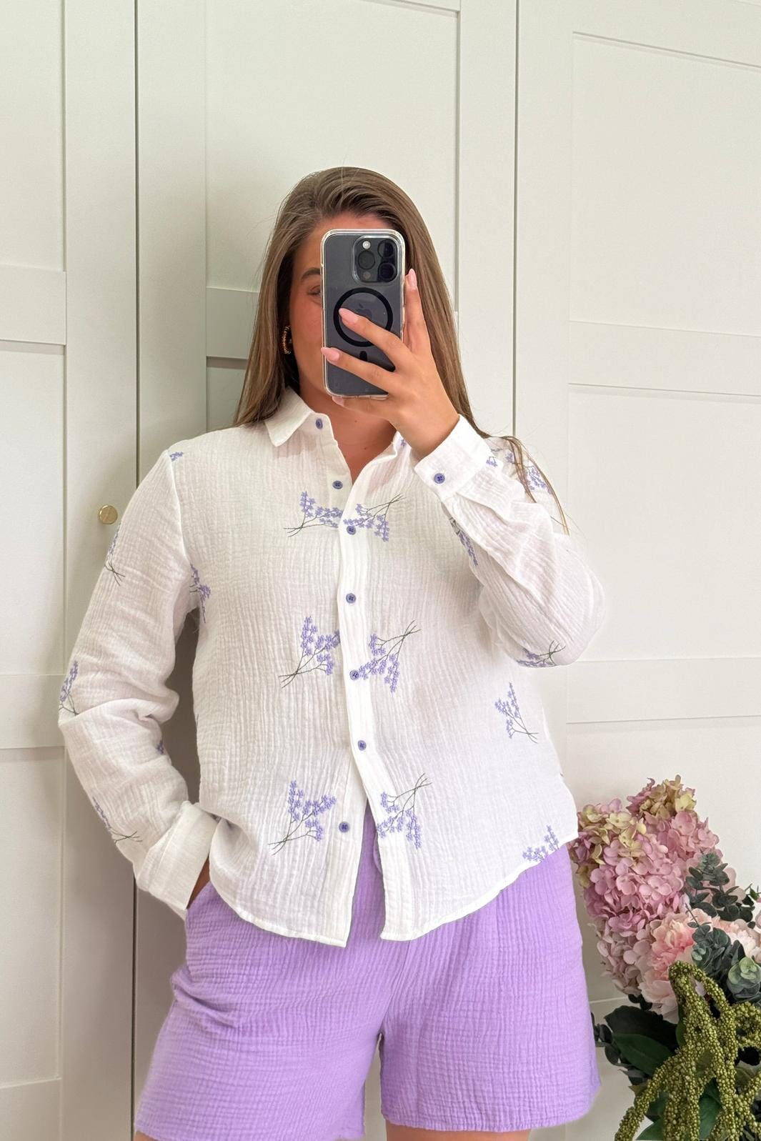 Valkoinen paita A-beeltä, jossa on lilaa kukkakirjontaa. Paidassa on rento malli ja pitkät hihat, joissa on klassinen kaulus ja nappilukitus edessä.