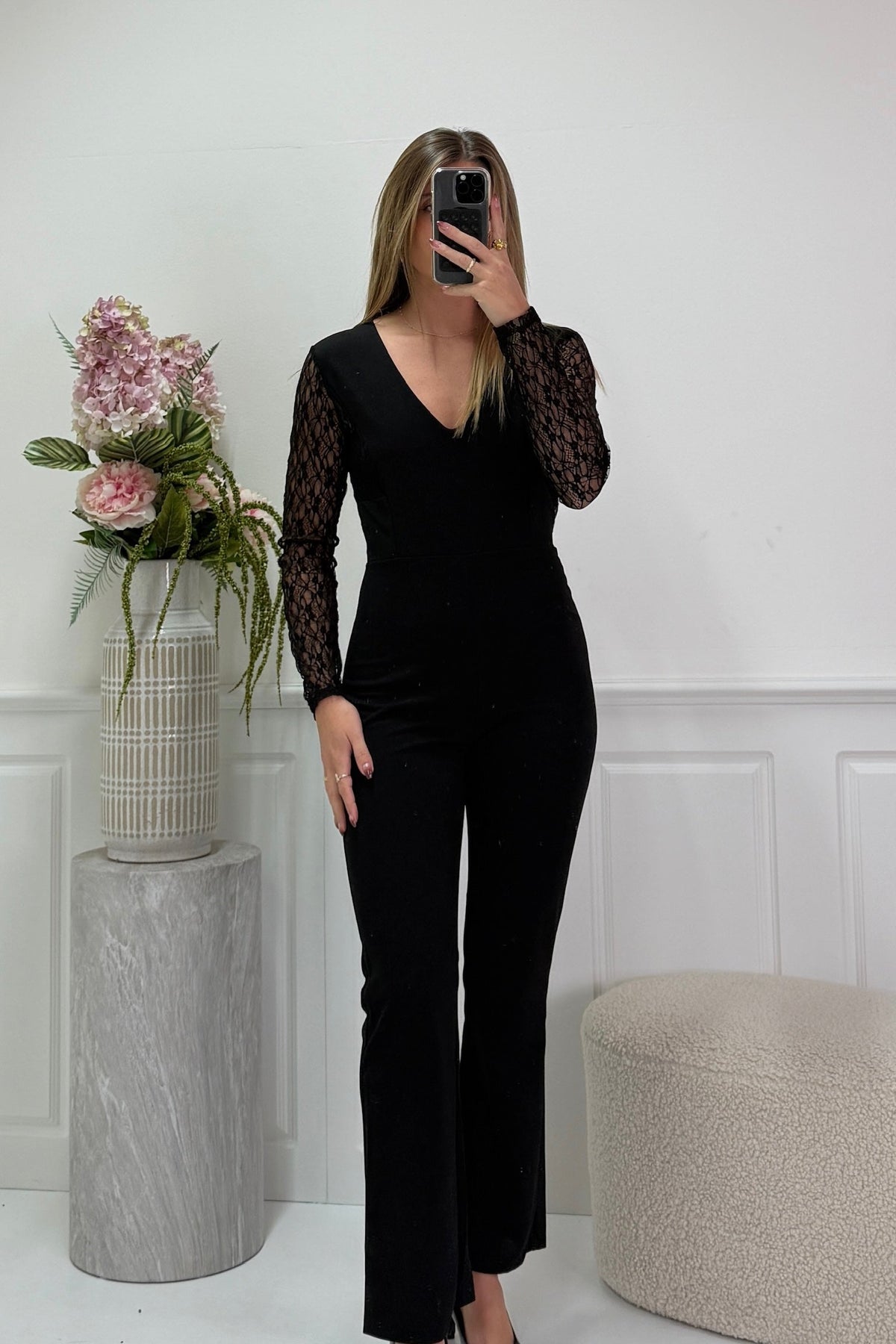 Musta A-bee-haalari pitsillä ja V-pääntiellä. Haalarissa on pitkät hihat ja pituus ulottuu pohkeen puoliväliin.