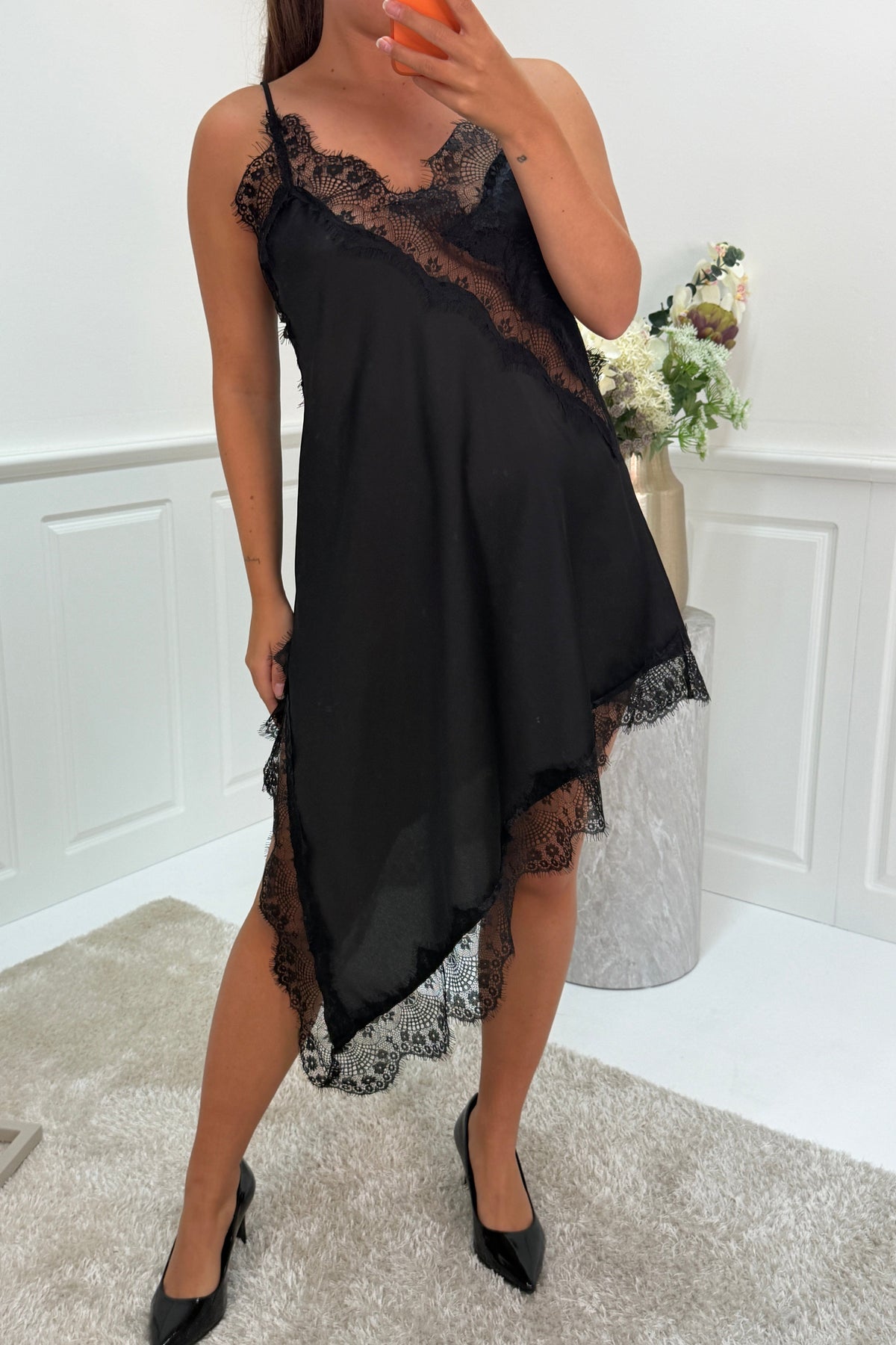 Musta juhlamekko A-beeltä V-pääntiellä ja epäsymmetrisellä helmalla. Mekossa on pitsiyksityiskohtia kaula-aukossa ja helmassa, mikä antaa suunnittelulle kauniin ilmeen.