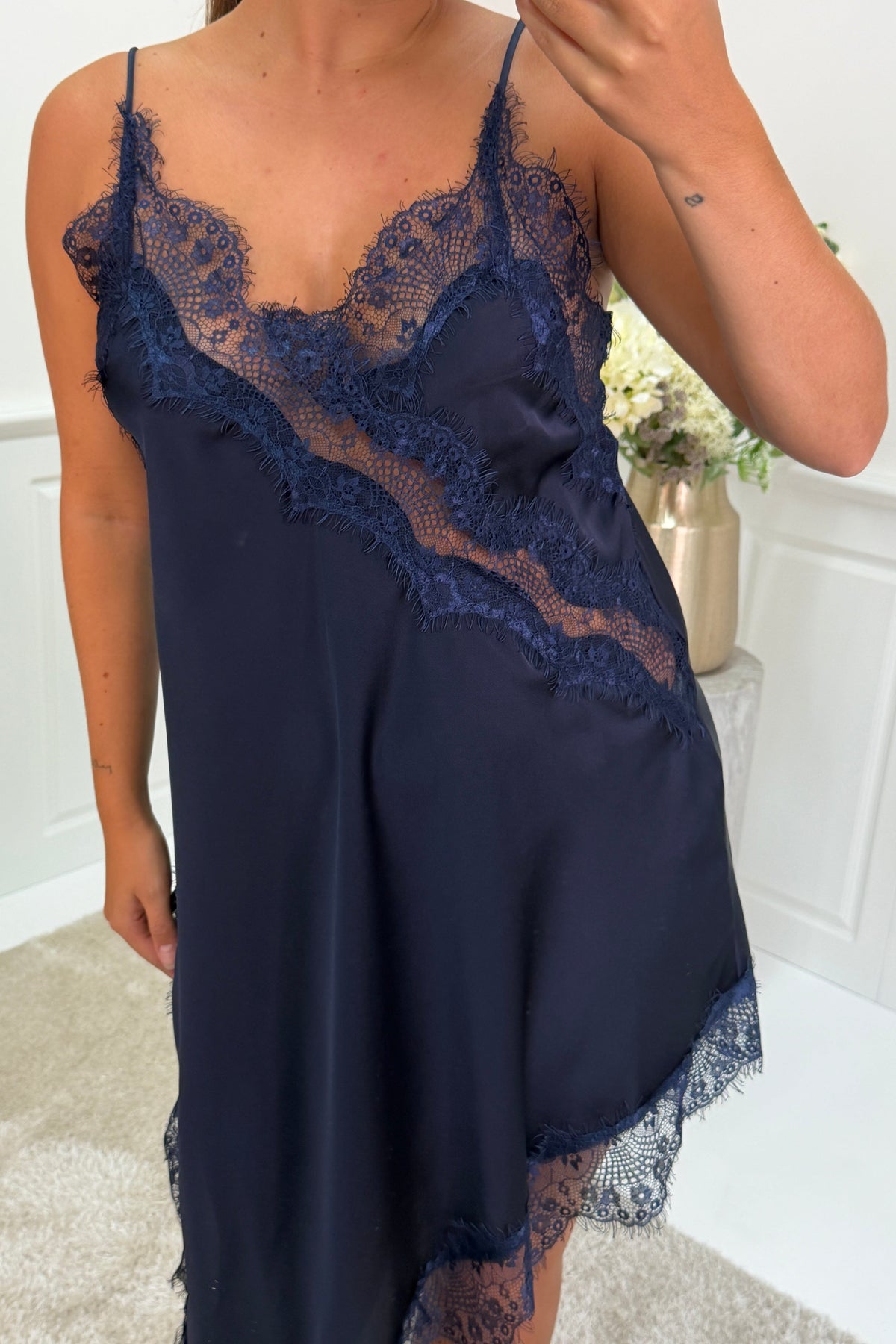Tummansininen mekko A-beeltä, jossa on löysä malli ja epäsymmetrinen helma. Mekossa on pitsiyksityiskohtia kaula-aukossa ja helman reunassa, sekä ohuet hihnat ja V-kaula-aukko.