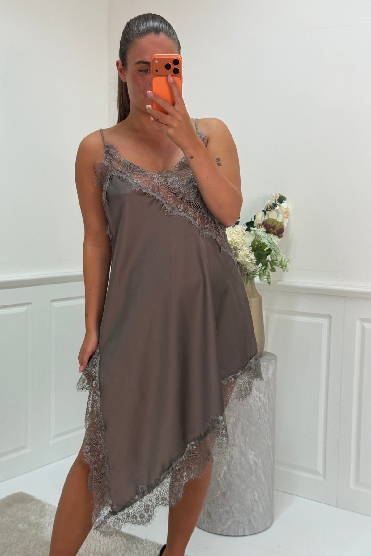 Polven pituinen mekko A-beeltä ruskean-harmaassa sävyssä. Mekossa on epäsymmetrinen helma, jossa on pitsiyksityiskohtia ja ohuet olkaimet. V-pääntie ja löysä malli tekevät siitä sopivan juhlatilaisuuksiin.
