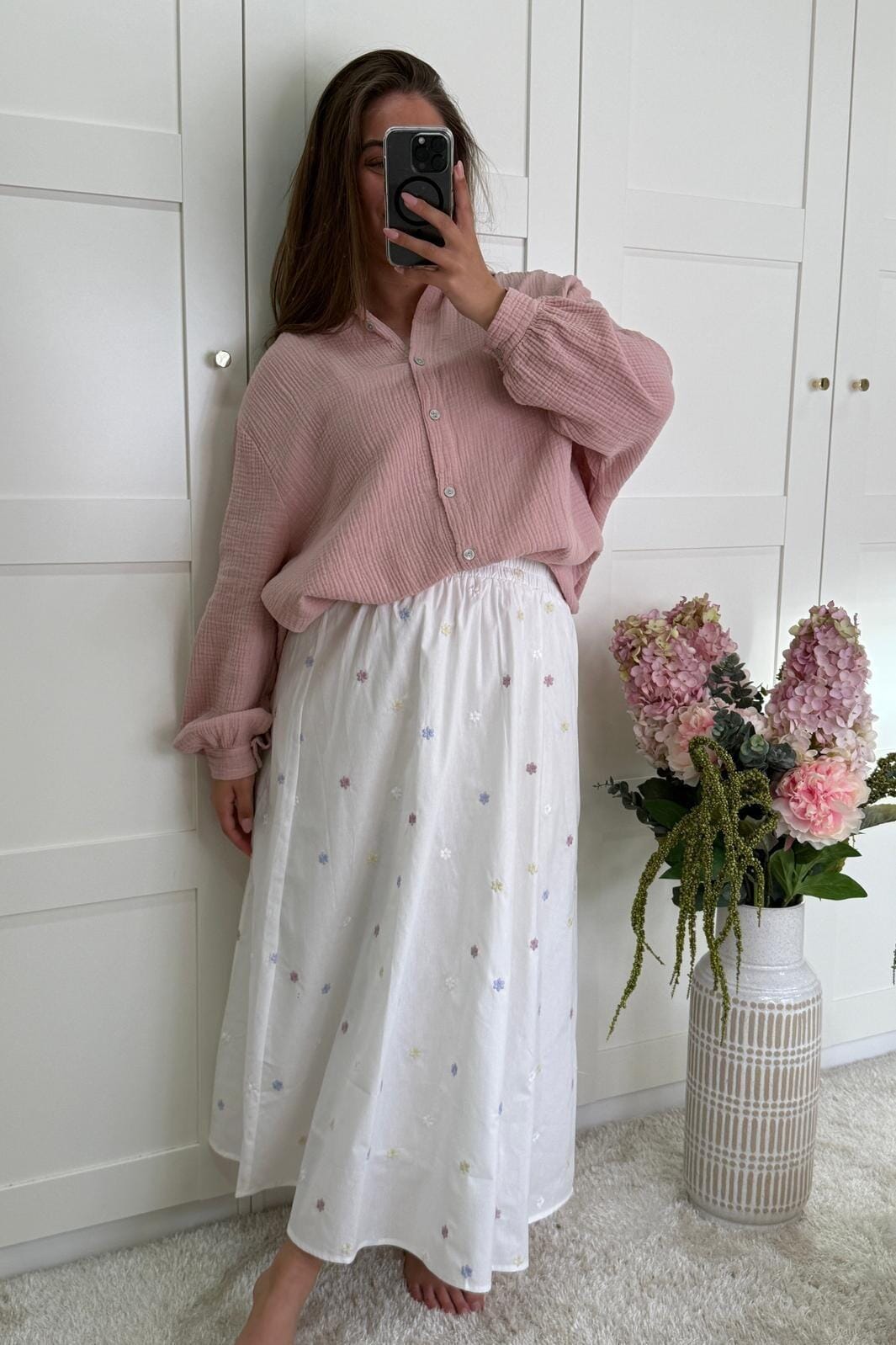 Valkoinen hame A-beeltä, jossa on brodeerattuja kukkia violetilla, keltaisella ja vaaleanpunaisella. Siinä on löysä istuvuus ja polvipituus, mikä tekee siitä käyttökelpoisen sekä arkeen että juhliin.