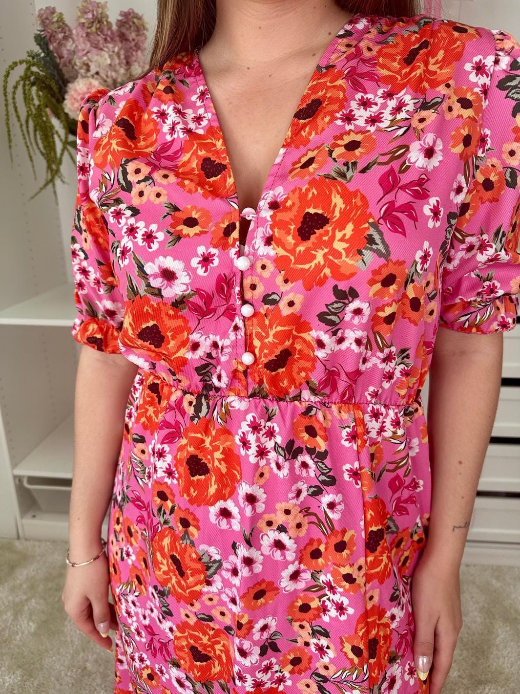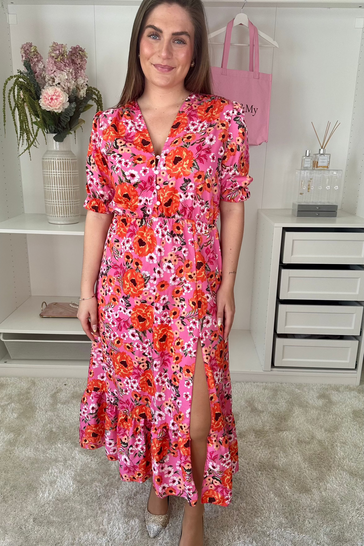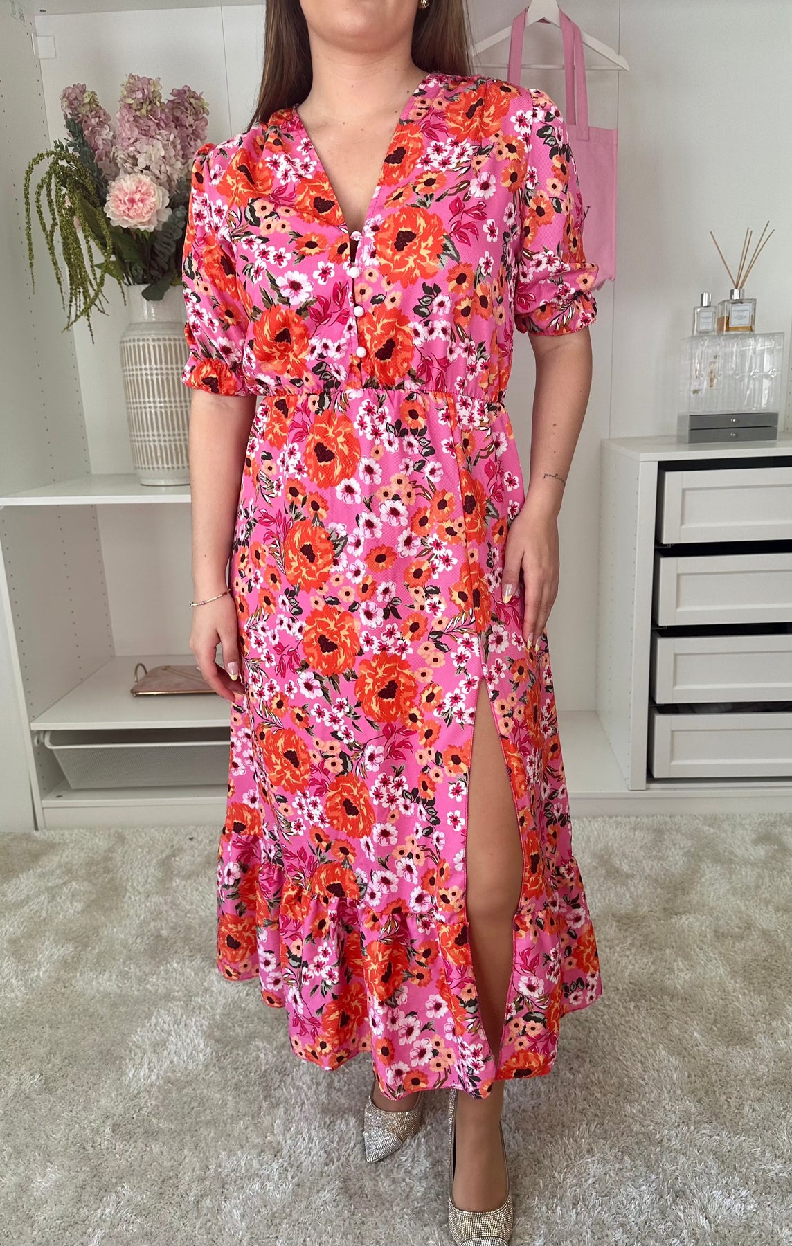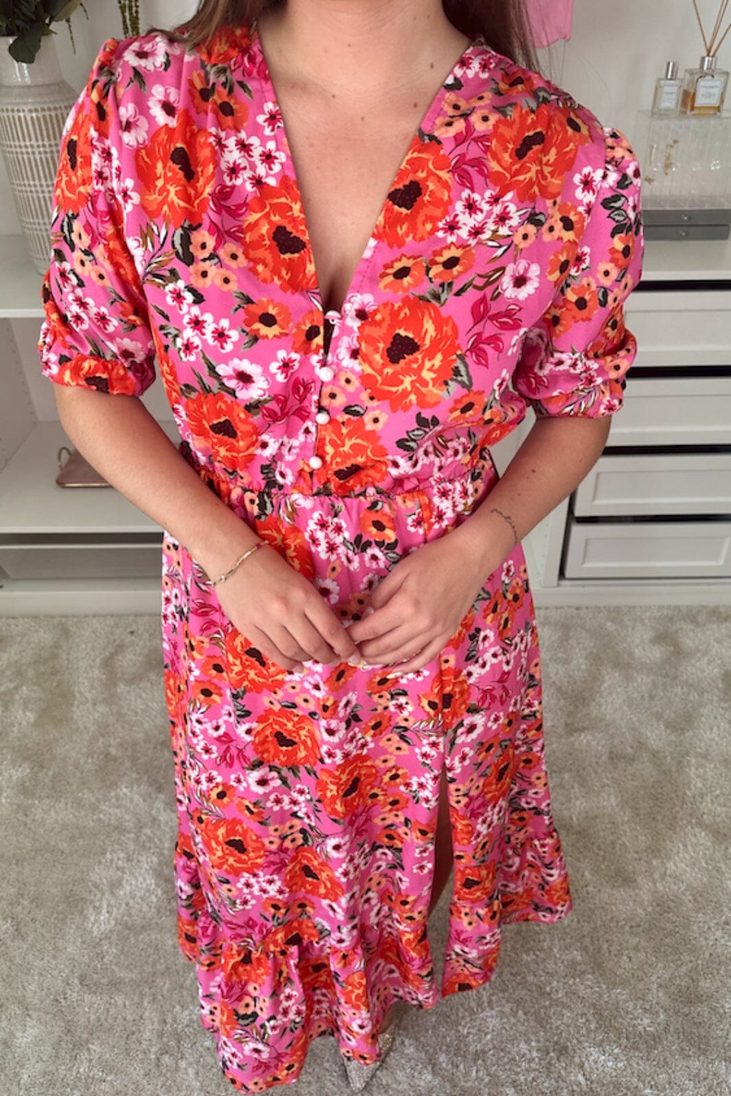 Nilkkapituinen mekko A-beelta, jossa on kukkakuosi vaaleanpunaisena ja oranssina. Mekossa on V-pääntie nappikiinnityksellä edessä ja halkio sivussa.