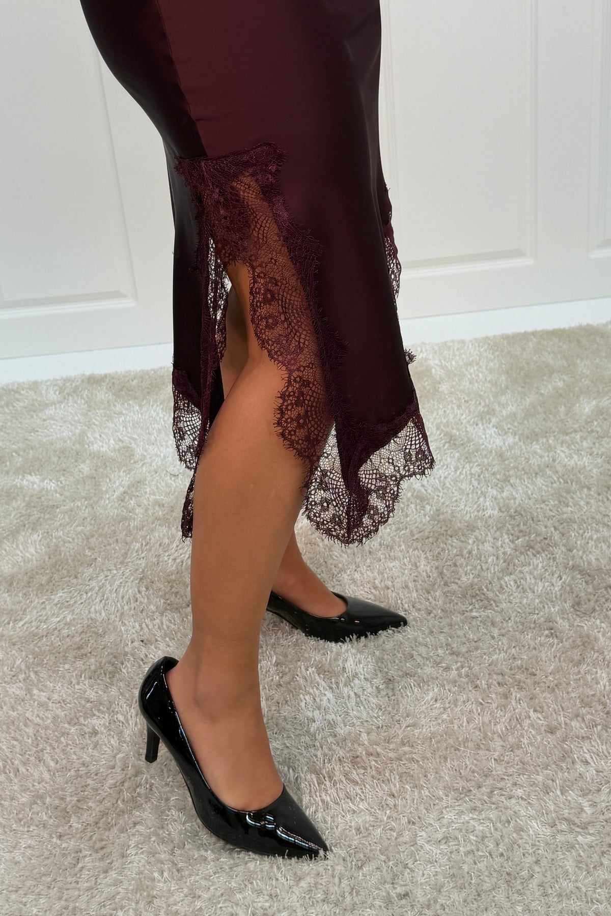 Plommonvärinen hame A-beeltä, jossa on pitsiyksityiskohtia reunassa. Hameen pituus on säären keskelle ja siinä on sileä pinta kiiltävällä viimeistelyllä.