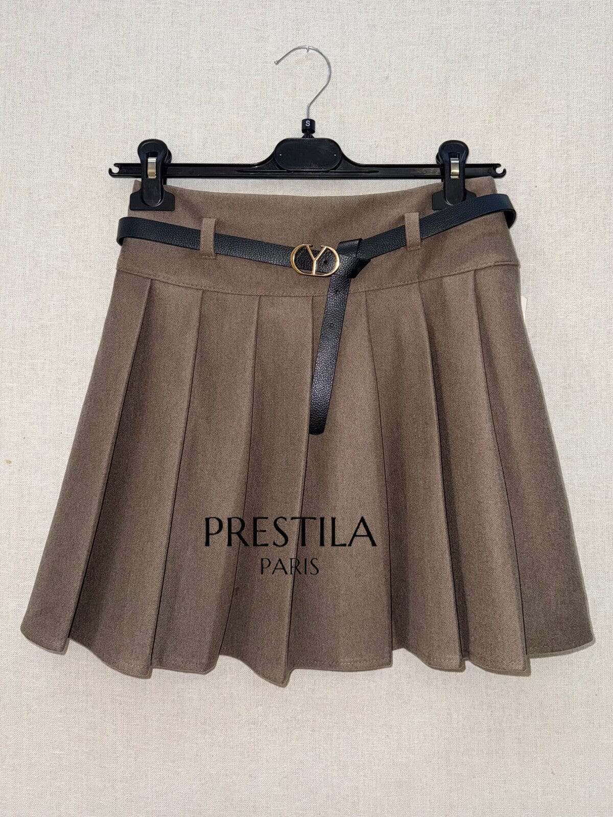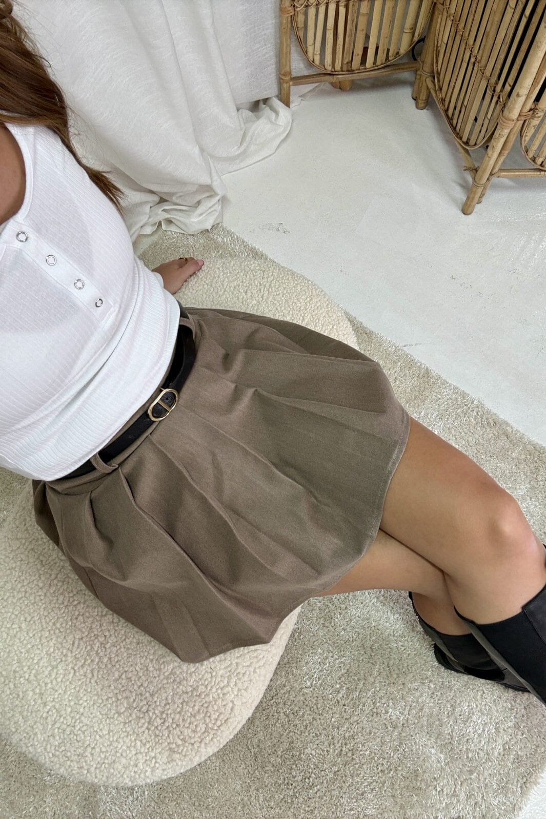 Pliseerattu hame A-beeltä taupe-värissä. Hameessa on kauniit pliseeraukset ja musta vyö soljella. Se istuu normaalissa vyötärökorkeudessa ja ulottuu reiden keskikohtaan.