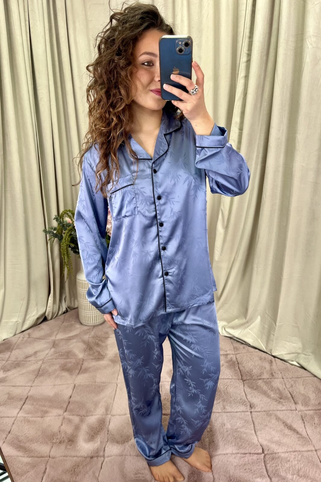 Sininen pyjama A-beeltä, jossa on bambulehtikuvio ja musta reunus. Setti koostuu paidasta, jossa on rintatasku, ja yhteensopivista housuista kiiltävästä kankaasta.