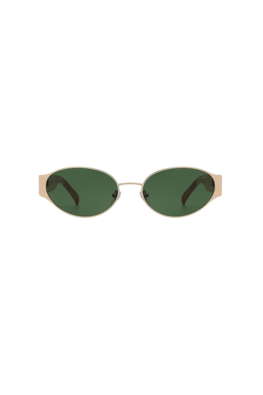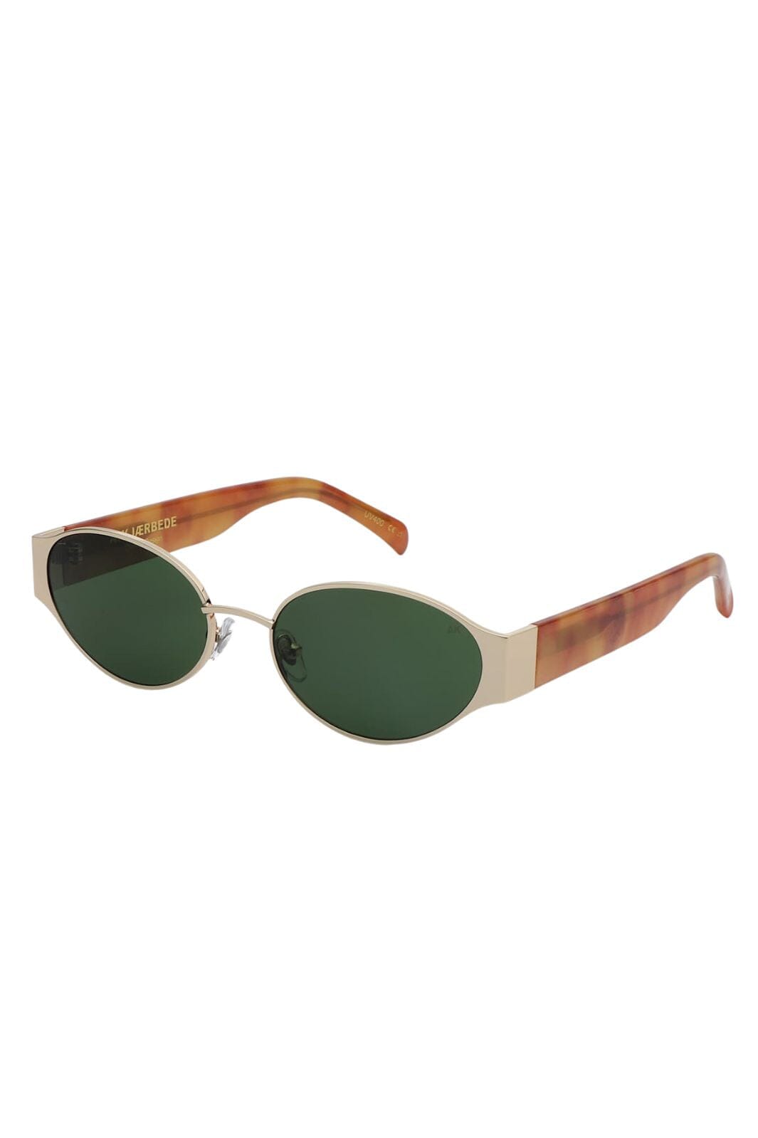 A. Kjærbede -aurinkolasit, joissa on soikeat linssit ja kultainen metallikehys. Linssien vihreä sävy antaa aurinkolaseille hillityn ilmeen, ja kehys on ohut siltamalli, jonka leveys on 18 mm.