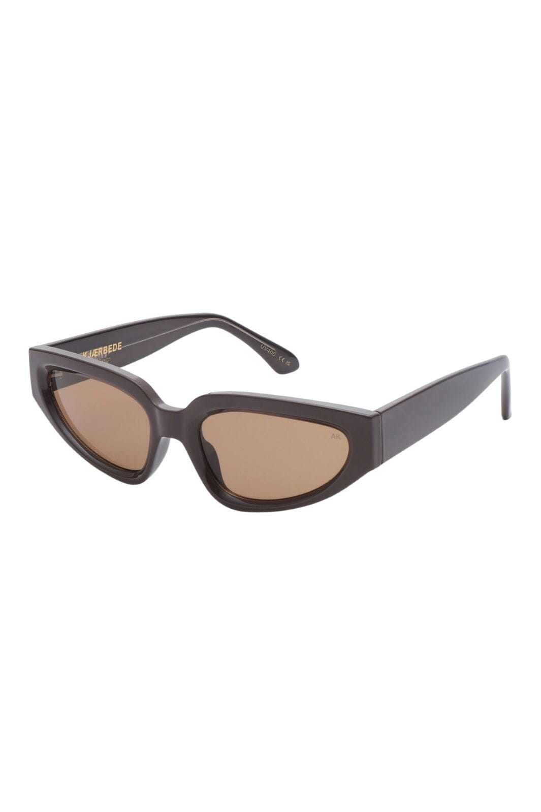 A. Kjærbede -aurinkolasit tumman suklaan värissä. Kehys on cat-eye-muotoinen, jossa on kapeat, soikeat linssit ja ylöspäin suuntautuva kehys, joka antaa retro-ilmeen.