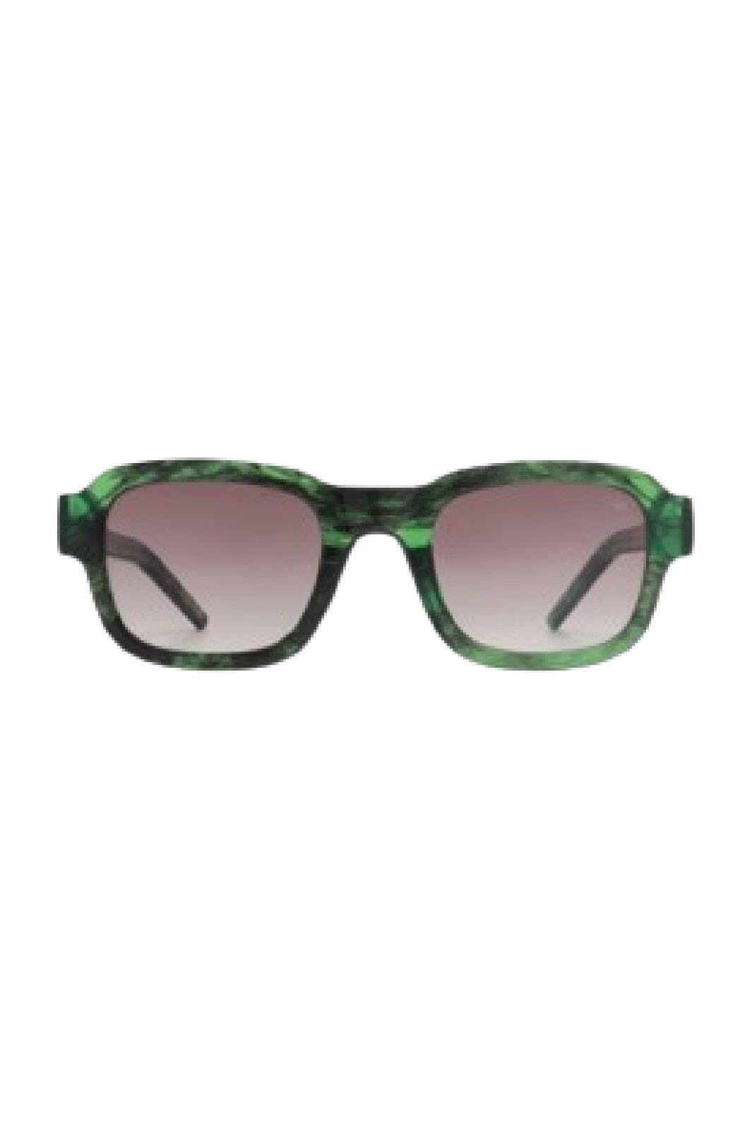 A. Kjærbede -aurinkolasit vihreällä marmorilla, läpinäkyvällä kehykset. Aurinkolaseissa on UV400-suoja ja ne on varustettu optisen laadun saranoilla sekä muovattavilla varsilla, joissa on metalliytimet.