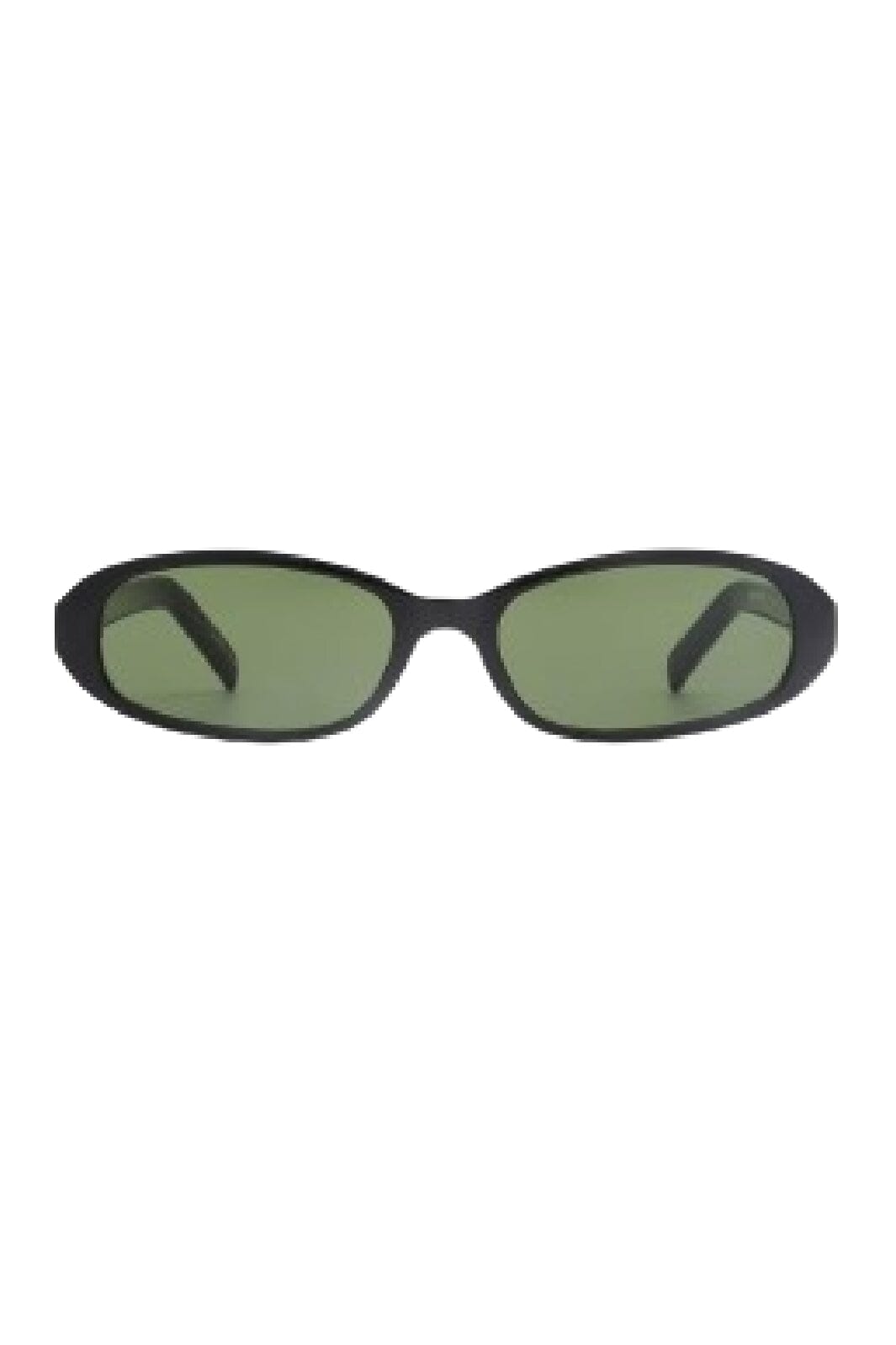 Musta aurinkolasit A. Kjærbede -mallilta, jossa on soikea muoto ja vihreät linssit. Kehyksellä on kevyt ylöspäin suuntautuva vaikutus ja kapeat linssit pehmeästi pyöristettyine kehykset.