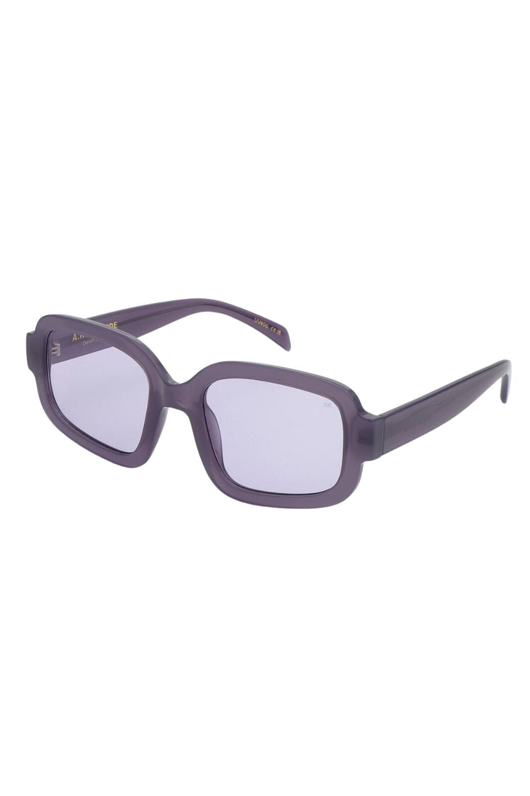 A. Kjærbede -aurinkolasit, joissa on suorakulmainen kehys purppuran sävyissä. Kehyksessä on vahva runko tummennetuilla linsseillä ja pehmeillä kaarilla suunnittelussa.