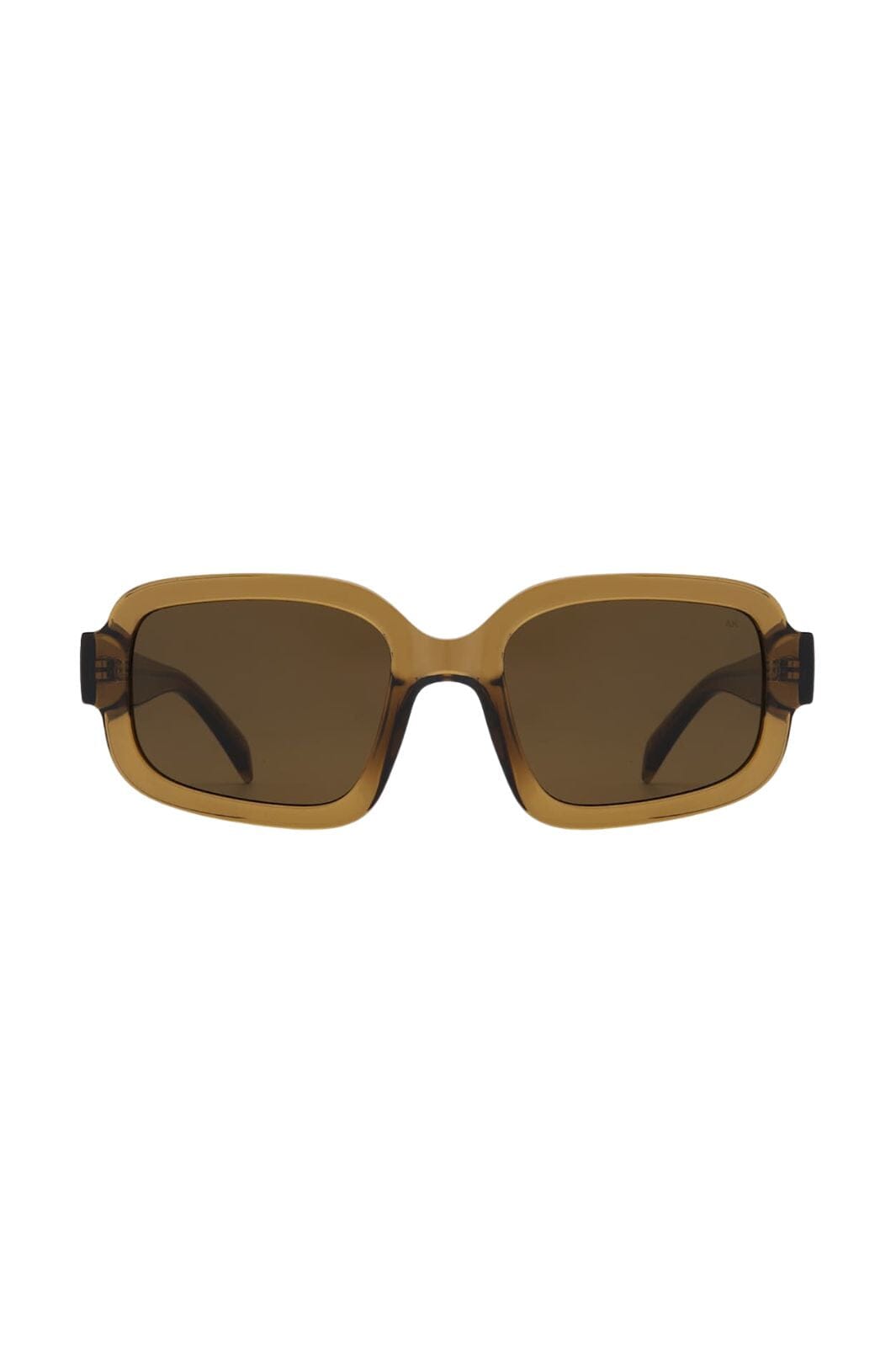 Yli koko aurinkolasit A. Kjærbede:ltä, joissa on vahva kehys läpinäkyvässä ruskeassa. Aurinkolasit ovat suorakulmaiset, pehmeillä kaarilla ja tummennetuilla linsseillä, jotka tarjoavat hyvää suojaa auringolta.