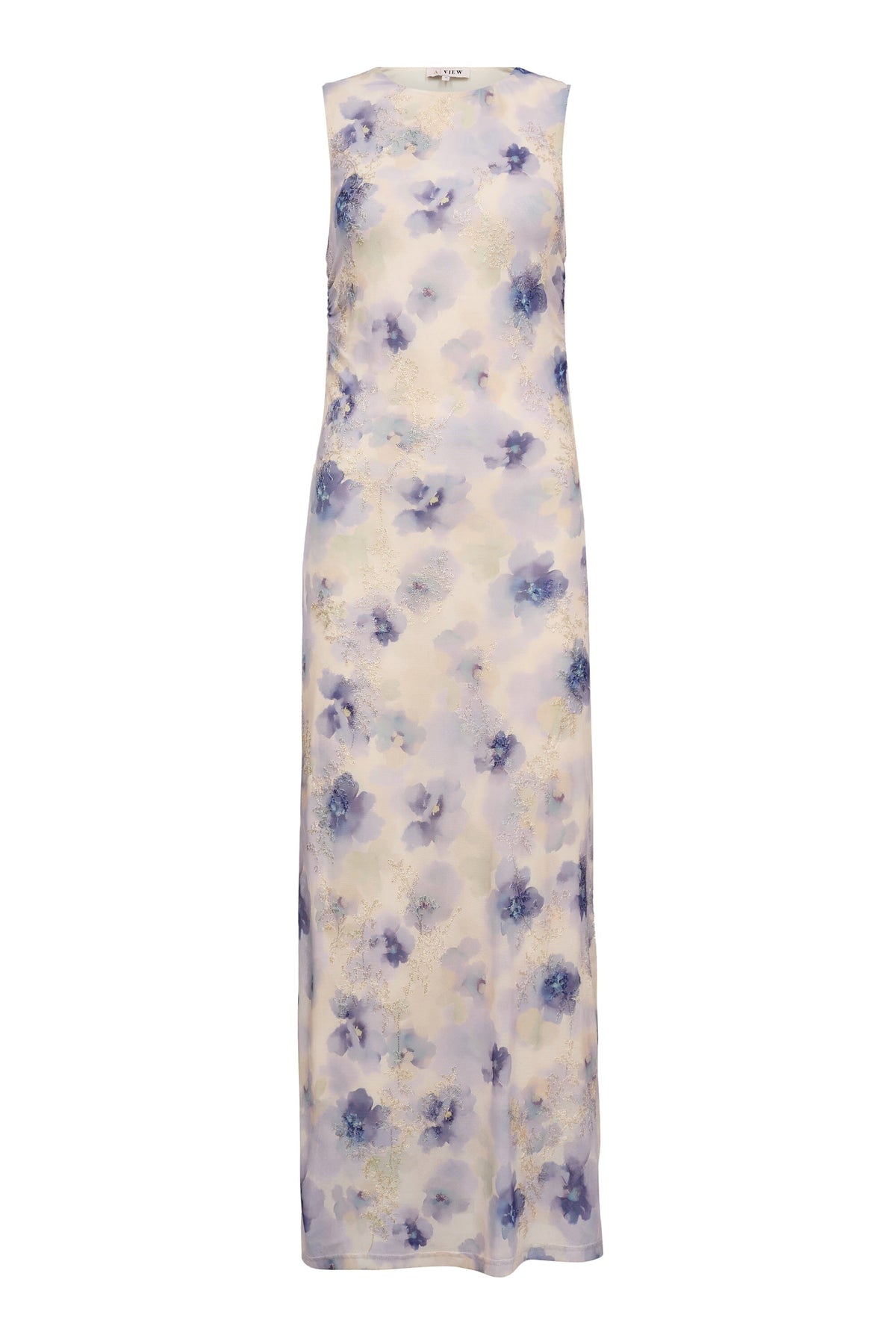 Hihaton mekko A-View’lta, jossa on liilan ja keltaisen sävyinen kukkakuvio. Mekko on valmistettu mesh-materiaalista ja sen pituus ulottuu hieman polven yläpuolelle.