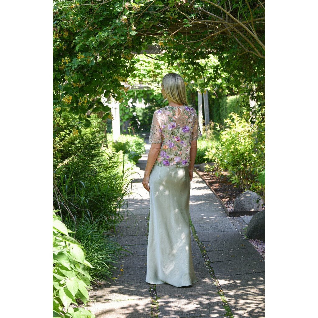 A-View-merkin pusero, joka on valmistettu läpikuultavasta mesh-materiaalista vihreän ja violetin sävyissä. Puserossa on kirjailtuja kukkia, ja se sopii sekä muodollisiin että juhlavampiin tilaisuuksiin.