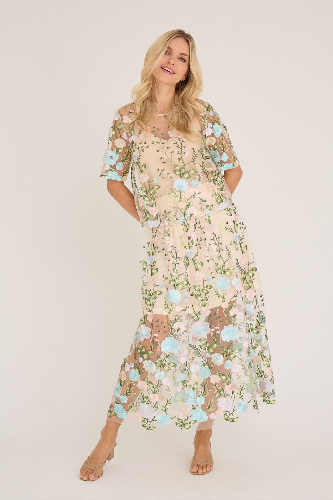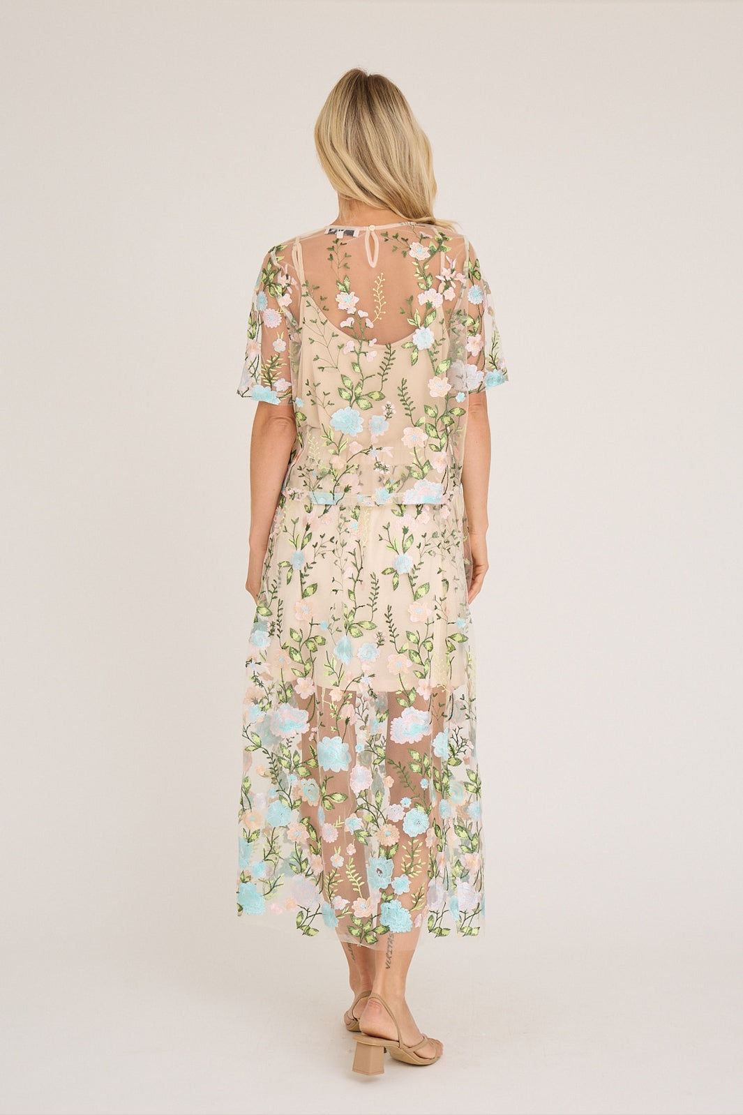 A-View-pusero, jossa on läpikuultava mesh-materiaali ja kirjailtuja kukkia vaaleanpunaisen ja sinisen sävyissä. Monivärinen kuvio antaa puserolle eloisan ilmeen.