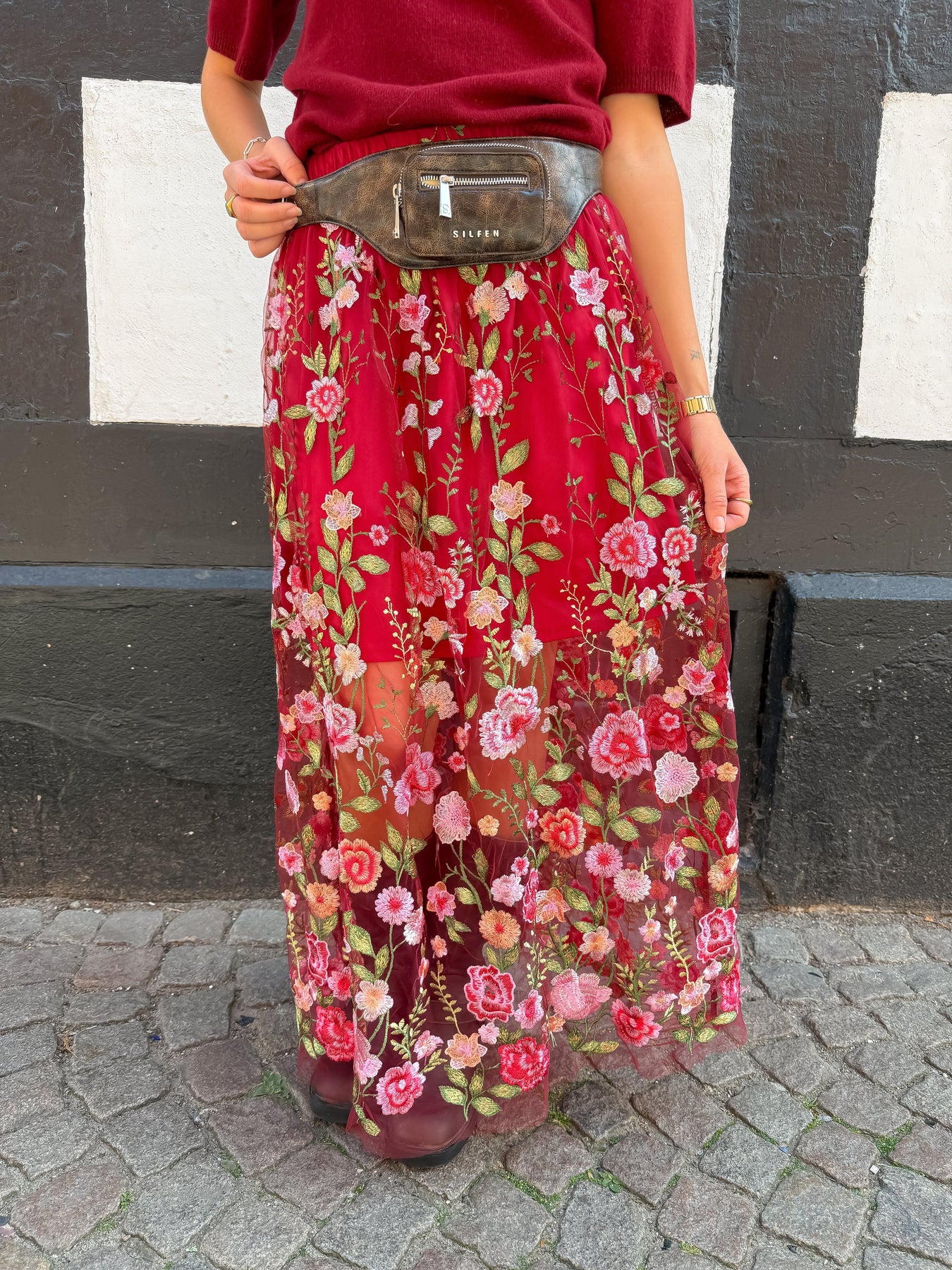 Pitkä hame A-View:ltä bordeaux- ja vaaleanpunaisissa sävyissä. Hameessa on läpinäkyvä kerros, jossa on brodeerattuja kukkia, ja se toimitetaan lyhyen alushameen kanssa bordeaux-värissä.