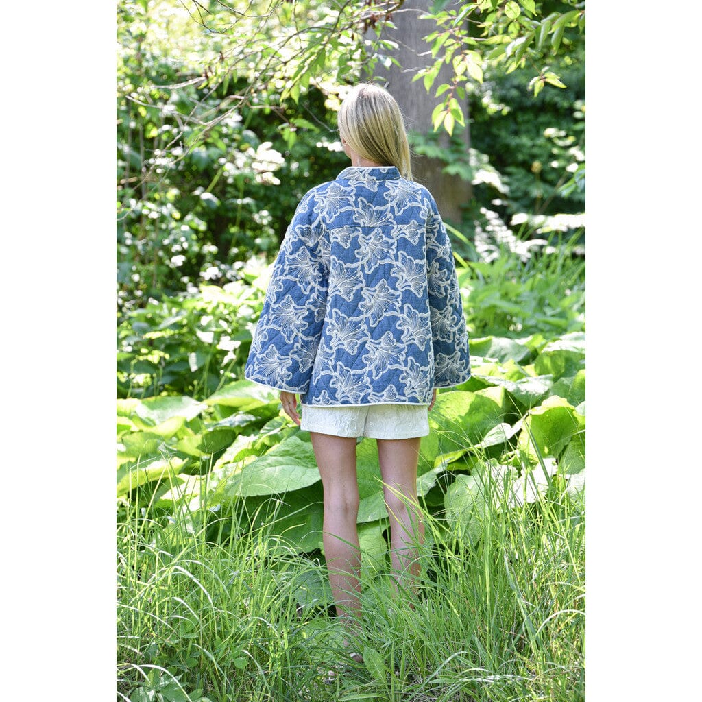 Sininen A-View -takki, jossa on luonnonvalkoista kukkakirjontaa. Takissa on koristeelliset tikkaukset ja nyöritysyksityiskohdat, jotka antavat sille käsintehdyn ilmeen.