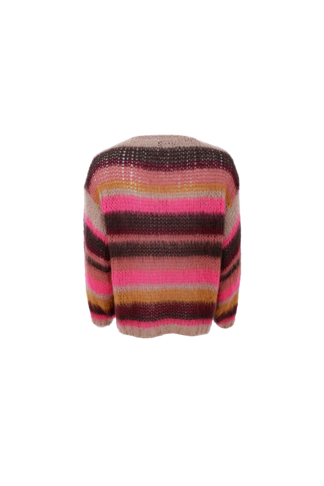 Raidallinen neule Black Colourilta vaakasuorilla raidoilla vaaleanpunaisena, ruskeana, beigenä ja oranssina. Neuleessa on löysä malli ja pyöreä kaula-aukko, joka tarjoaa hyvää liikkuvuutta.