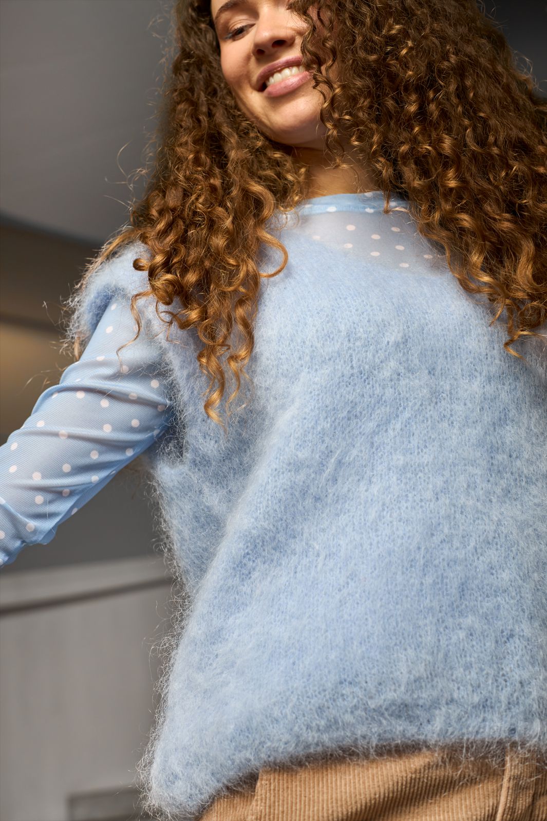 Meshpusero Black Colour -merkiltä vaaleansinisessä sävyssä, jossa on valkoisia pilkkuja. Puserossa on rypytyksiä, pitkät hihat ja pyöreä pääntie.
