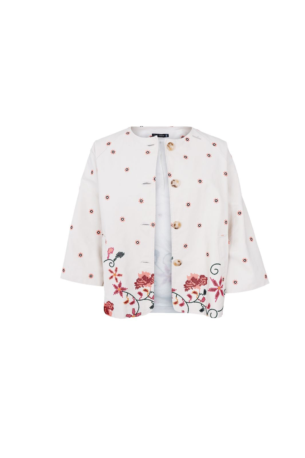 Takki Black Colour -merkiltä valkoisen ja kerman sävyssä, jossa on kukkakirjailuja. Takissa on suuret napit edessä ja pieniä, hajanaisia kuvioita koko pinnalla.