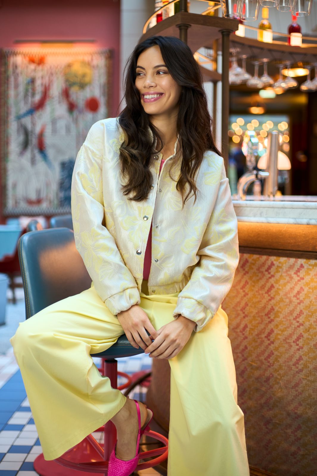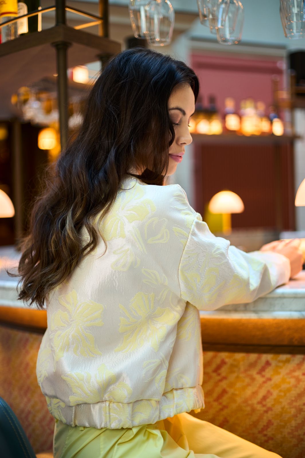 Bombertakki Black Colour -merkiltä vaaleankeltaisena kukallisella printillä. Takissa on korkea pääntie ja pitkät hihat. Materiaali on polyesterin ja puuvillan sekoitetta.