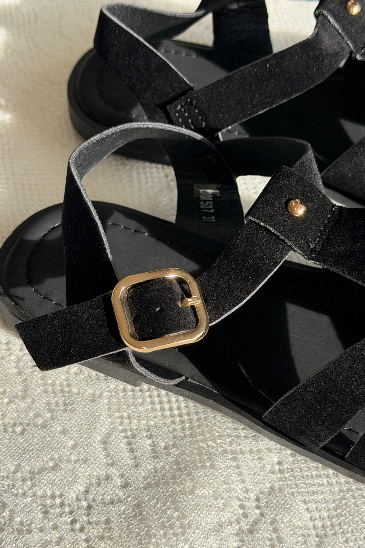 Mustat Bloom-sandaalit, joissa on avoin kärki ja leveät, toistensa yli menevät remmit. Sandaaleissa on kultainen solki, ja ne sopivat rennon tyylisiin tilanteisiin.