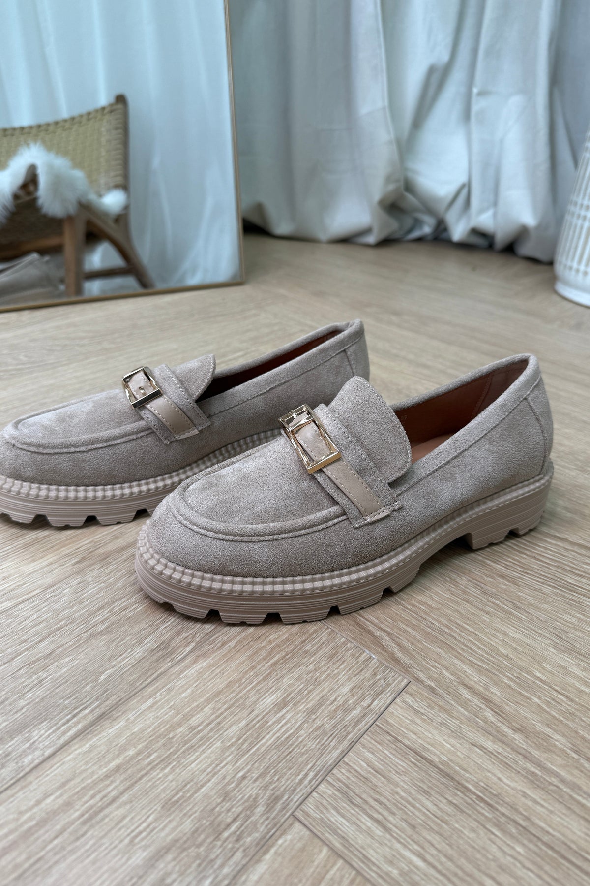 Beiget loafers-kengät Bloomilta, valmistettu tekstiilistä. Kengissä on blokkikorko ja metallisolki edessä, mikä luo klassisen loafers-ilmeen.