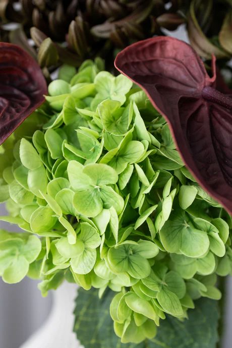 Bloom Objects -kimppu, jossa on vihreitä krysanteemeja, tummanvihreää amaranttia ja bordeaux’nvärinen anthurium. Kimppu on valmistettu lateksista luonnollisen näköiseksi.