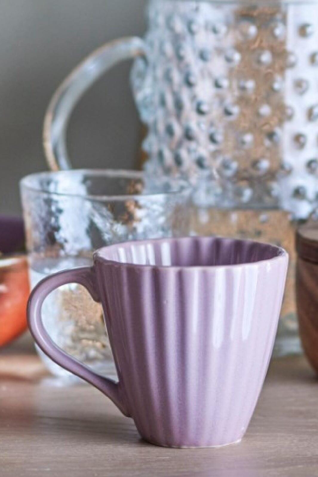 Vaaleanpunainen muki Bloomingvilletä, jossa on uritettuja yksityiskohtia. Muki on käsinmaalattu kivitavarasta ja siinä on tyypillinen pystysuora rakenne ulkopuolella.