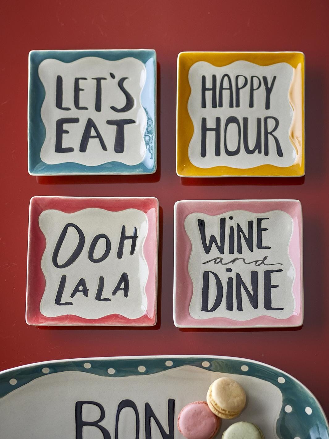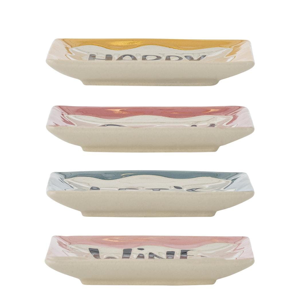 Suorakulmaiset Bloomingvillen lautaset kivitavarasta, joissa on käsinmaalatut pinnat. Jokaisessa lautasessa on kermanvärinen alue keskellä ja värilliset reunat pinkin, keltaisen, sinisen tai punaisen sävyissä.