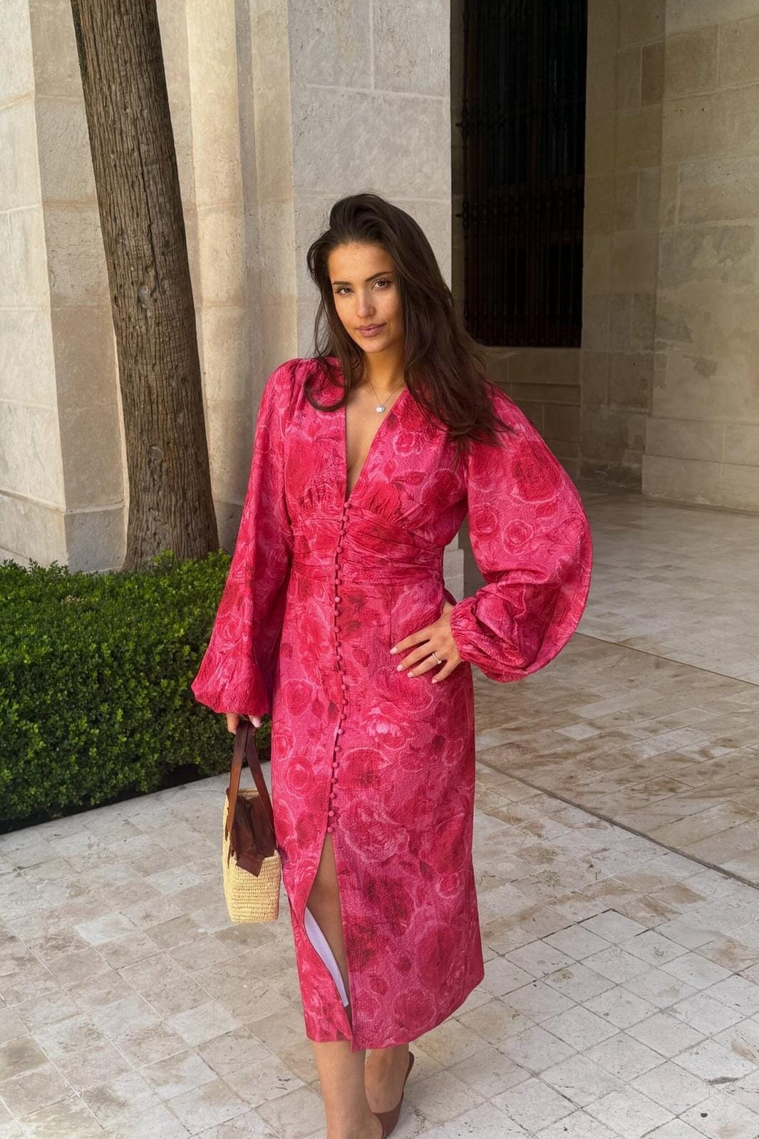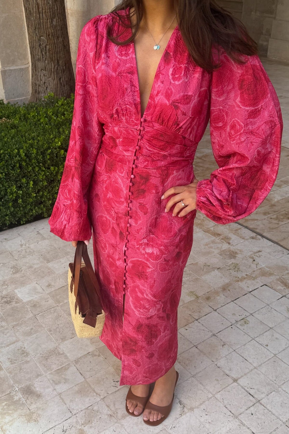 Pitkä mekko BYIC:ltä, jossa on vaaleanpunainen ruusukuvio. Mekossa on pitkät, kevyesti pussitetut hihat ja V-pääntie, jossa on kangaspäällysteiset napit edessä.