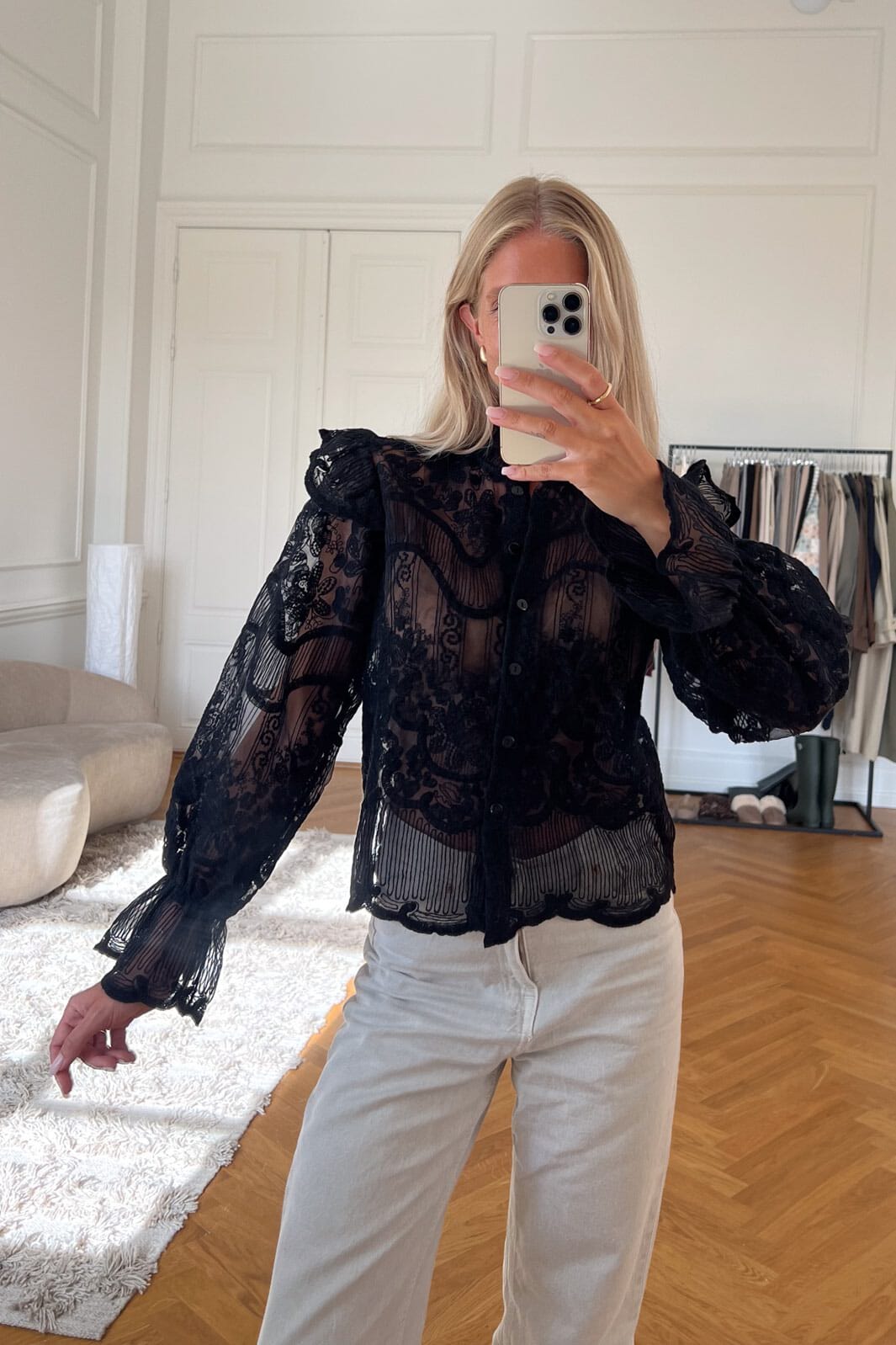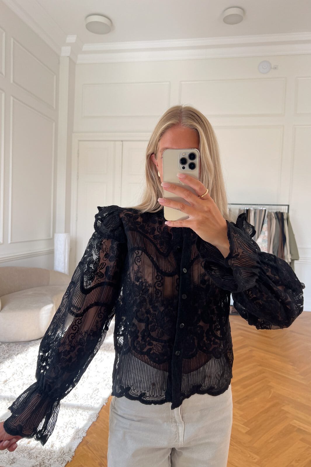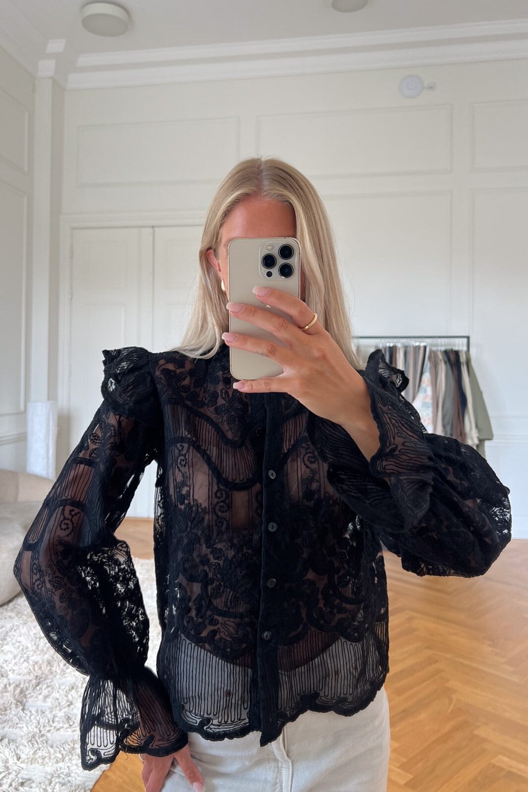 Musta paita läpinäkyvästä pitsistä, jossa on korkea kaulus ja nappilukko. Paidassa on puffihihat, joissa on röyhelöyksityiskohtia, ja se on löysästi istuva, mikä tekee siitä sopivan sekä arkeen että juhliin.