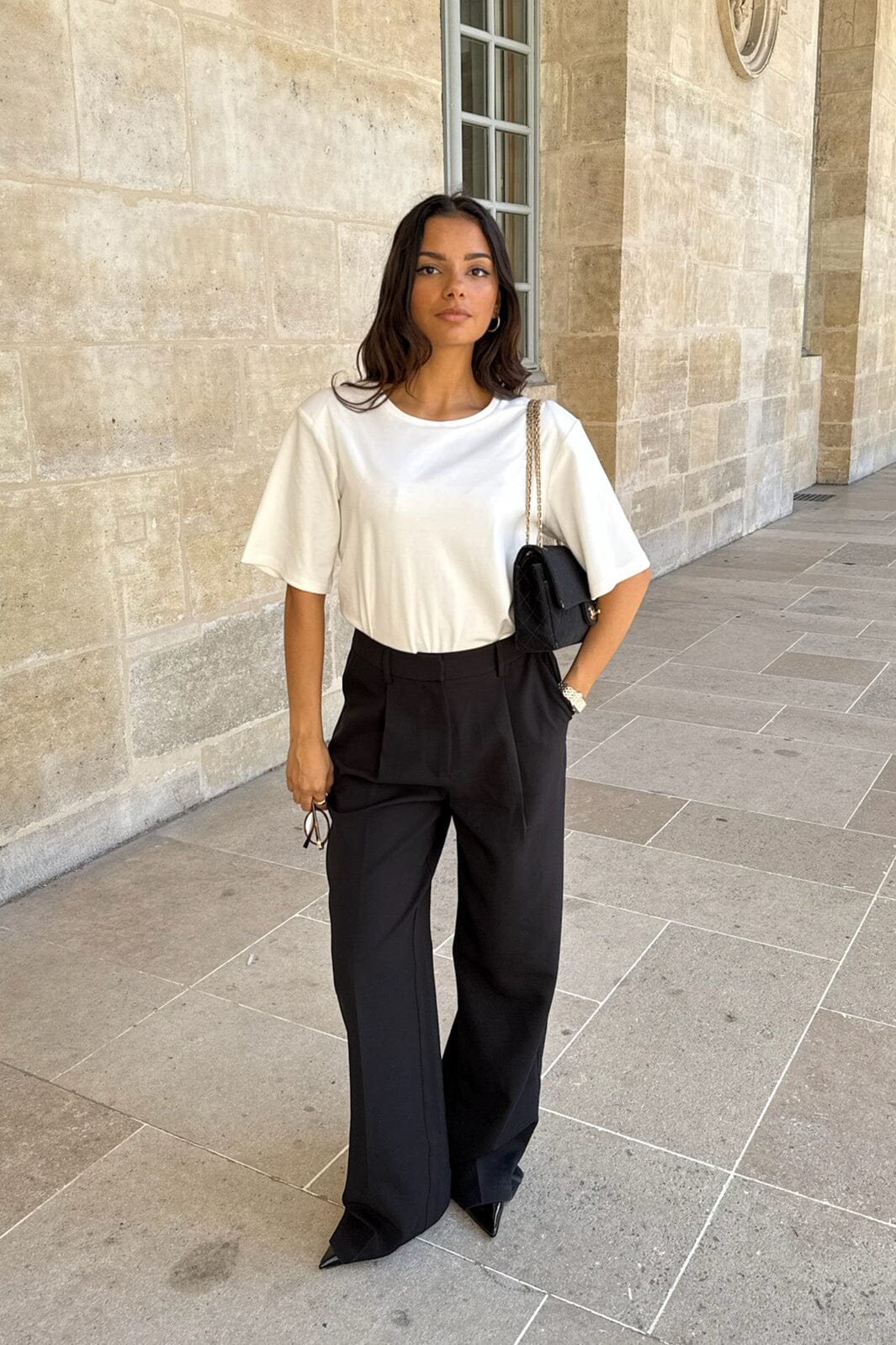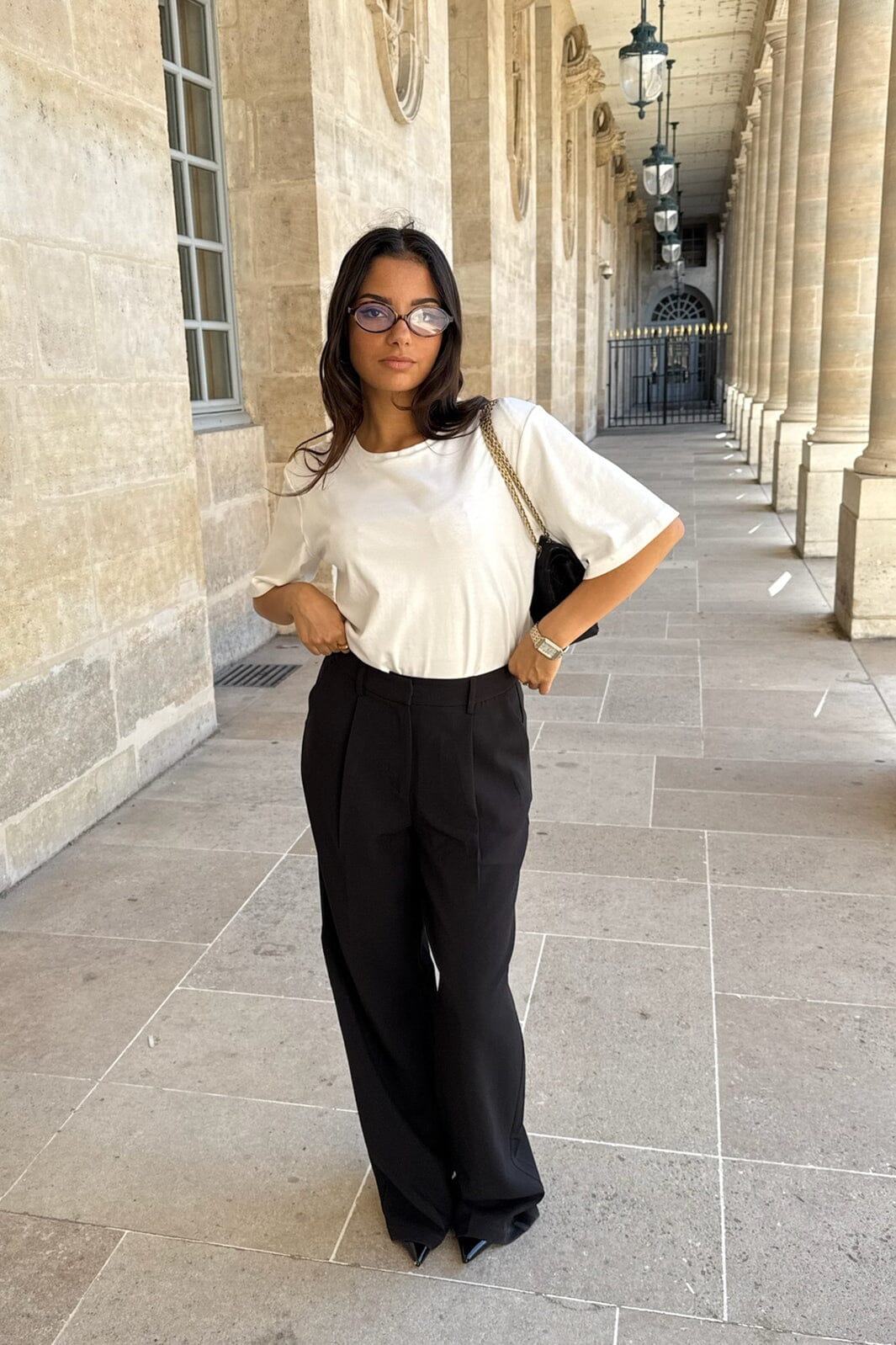 Mustat housut BYIC:ltä korkealla vyötäröllä ja leveillä lahkeilla. Housuissa on löysä istuvuus ja ne ulottuvat lattiaan asti, mikä tekee niistä sopivia sekä arkeen että juhliin.