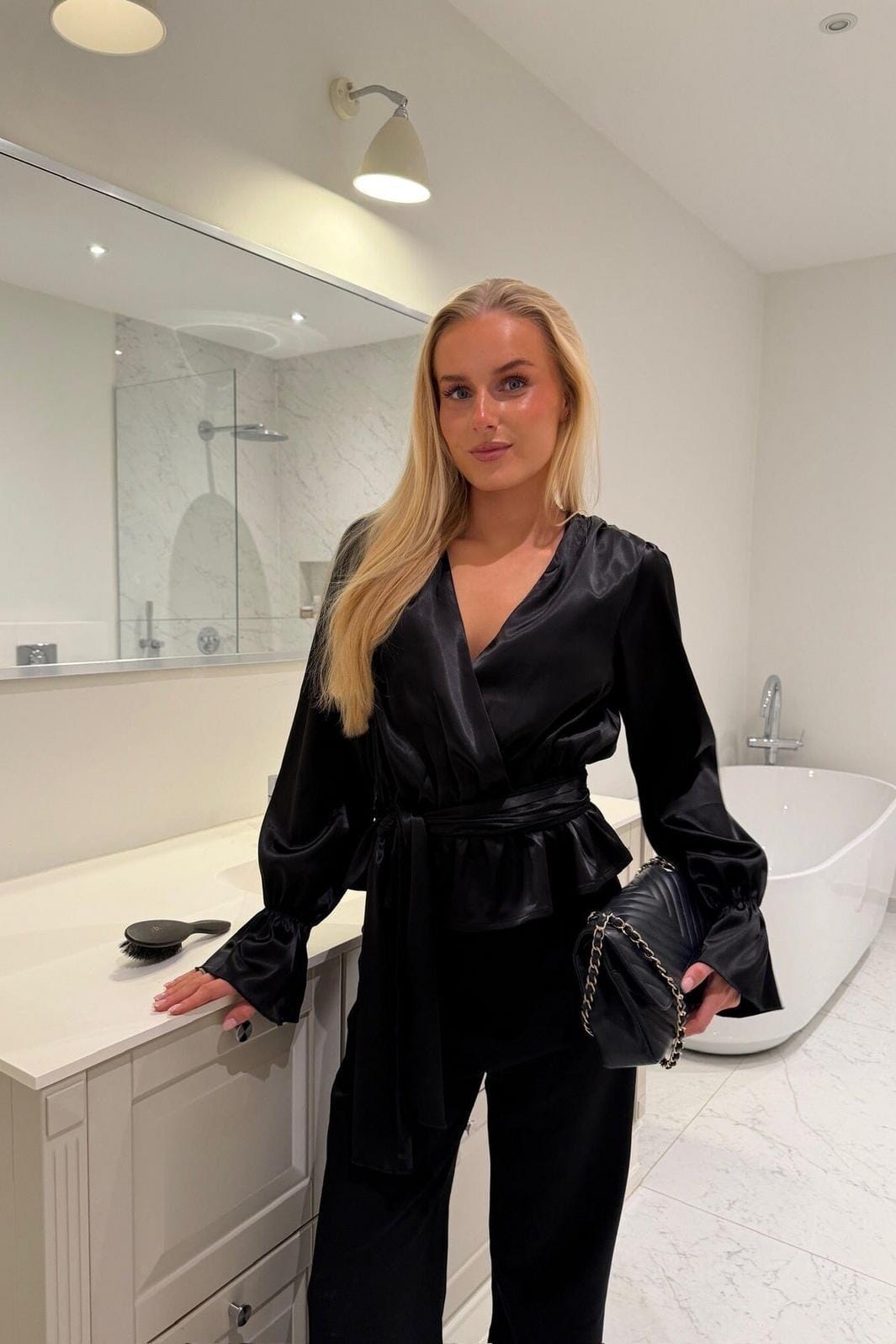 Musta satiinipaita BYIC:ltä V-pääntiellä ja nauhalla. Paidassa on löysä malli, jossa on korostettu vyötärö ja puffihihat, joissa on joustavat hihansuut.