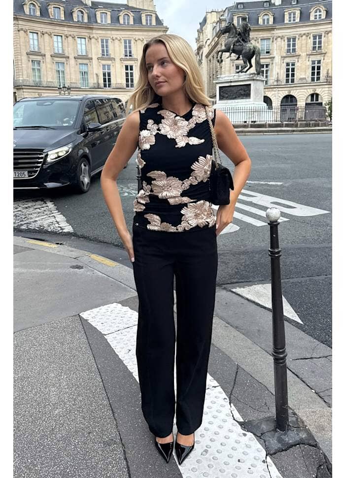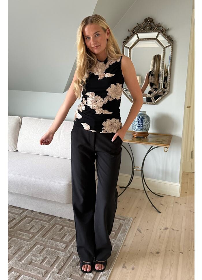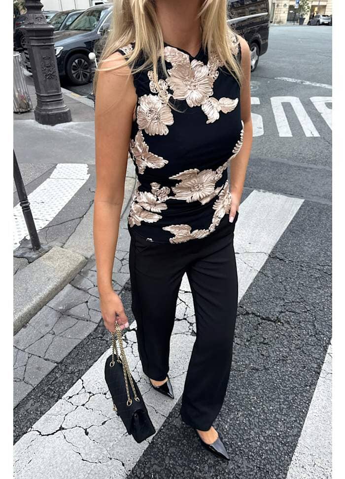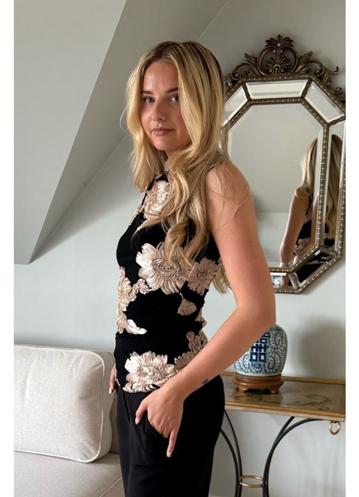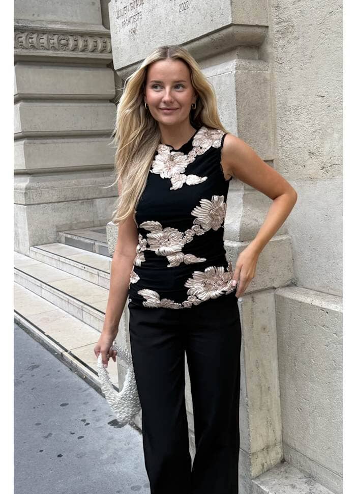 Musta verkkotoppi BYIC:ltä, jossa on brodeerattuja kukkia beigen värisenä. Topissa on 3D-kukkadetaileja ja röyhelöitä olkapäissä, mikä luo ainutlaatuisen muotoilun rypytyksillä sivuilla.