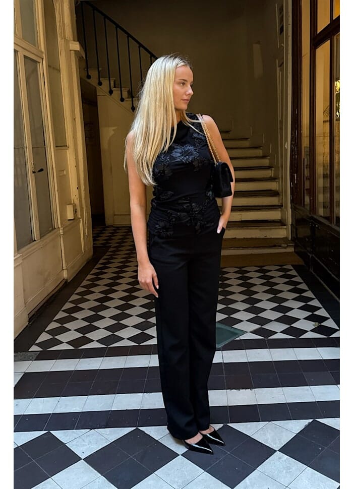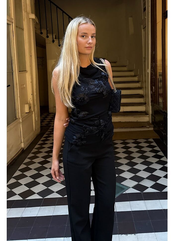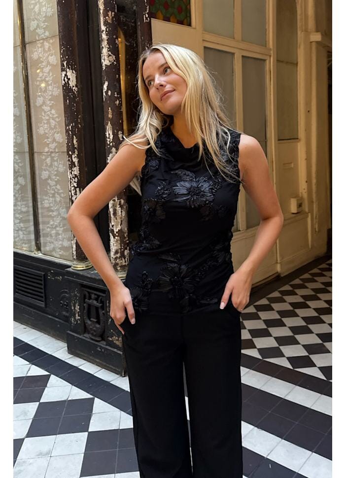 Musta mesh-top BYIC:ltä, jossa on 3D-kukkakuosi. Topissa on pieniä röyhelöitä olkapäillä ja rypytysdetaljeita sivuilla, jotka antavat sille rakennetta ja muotoa.