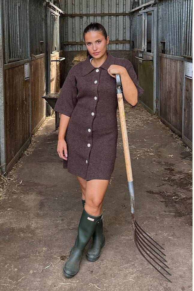 BYIC:n tummanruskea neulemekko, jossa on kauluspaita ja napit koko matkalta alas. Siinä on 3/4-hihat ja suora leikkaus, joka ulottuu reiden keskelle.