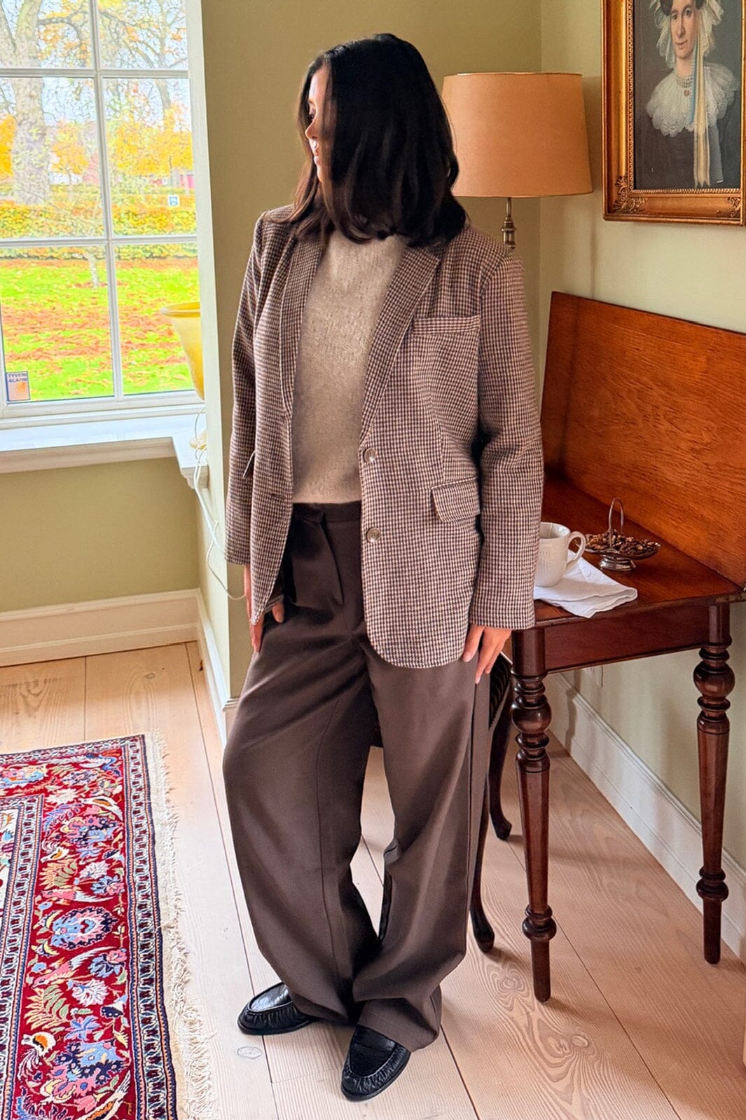 Ruskea ruudullinen bleiseri BYIC:ltä, joka on valmistettu kankaasta, jossa on 96 % polyesteriä ja 4 % elastaania. Bleiserissä on kauluspaita, nappikiinnitys ja kaksi etutaskua.
