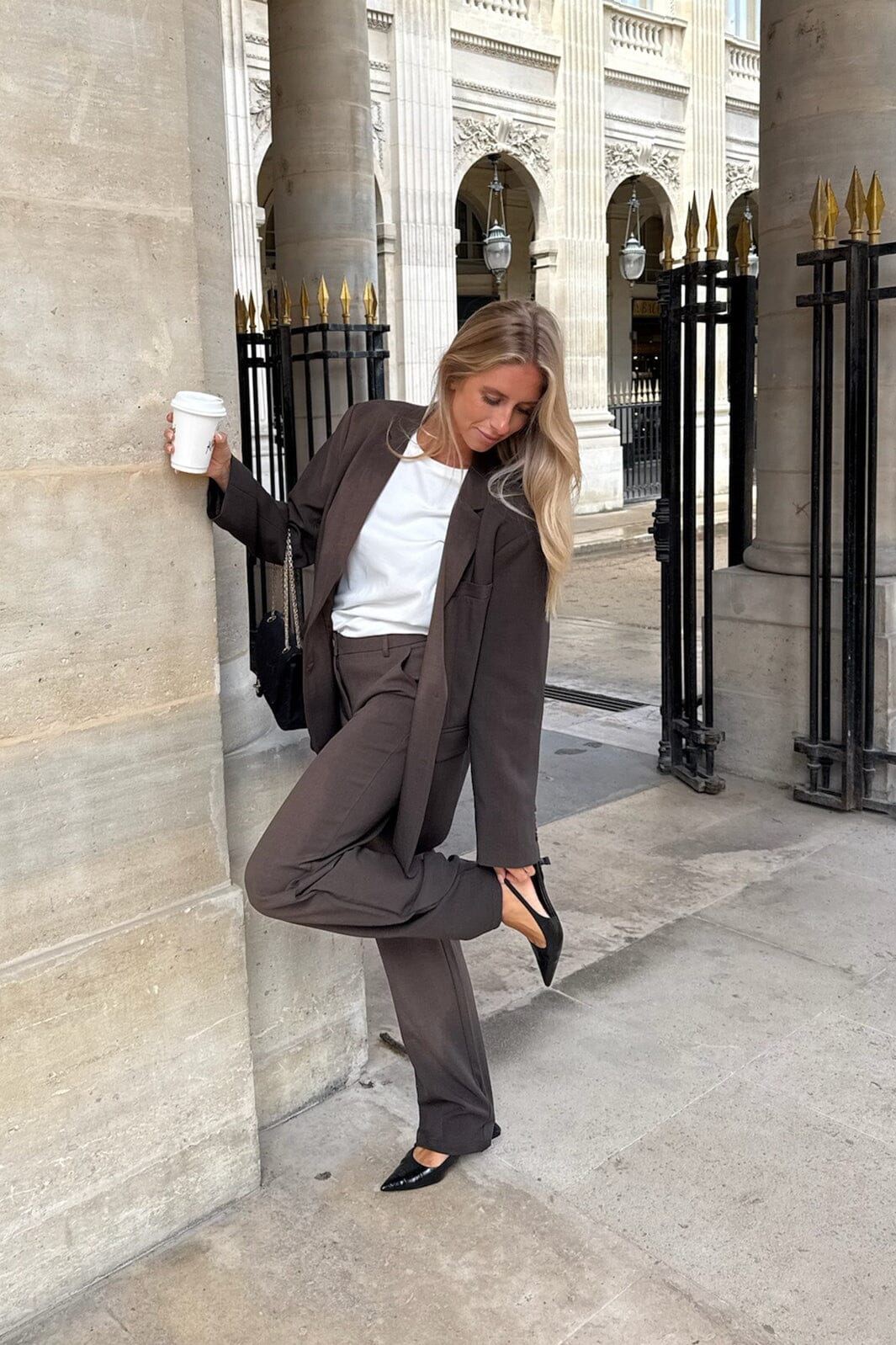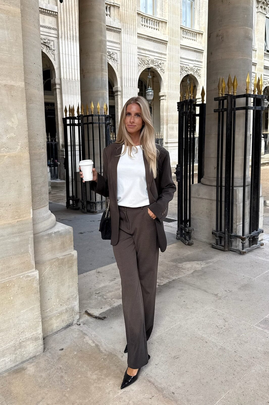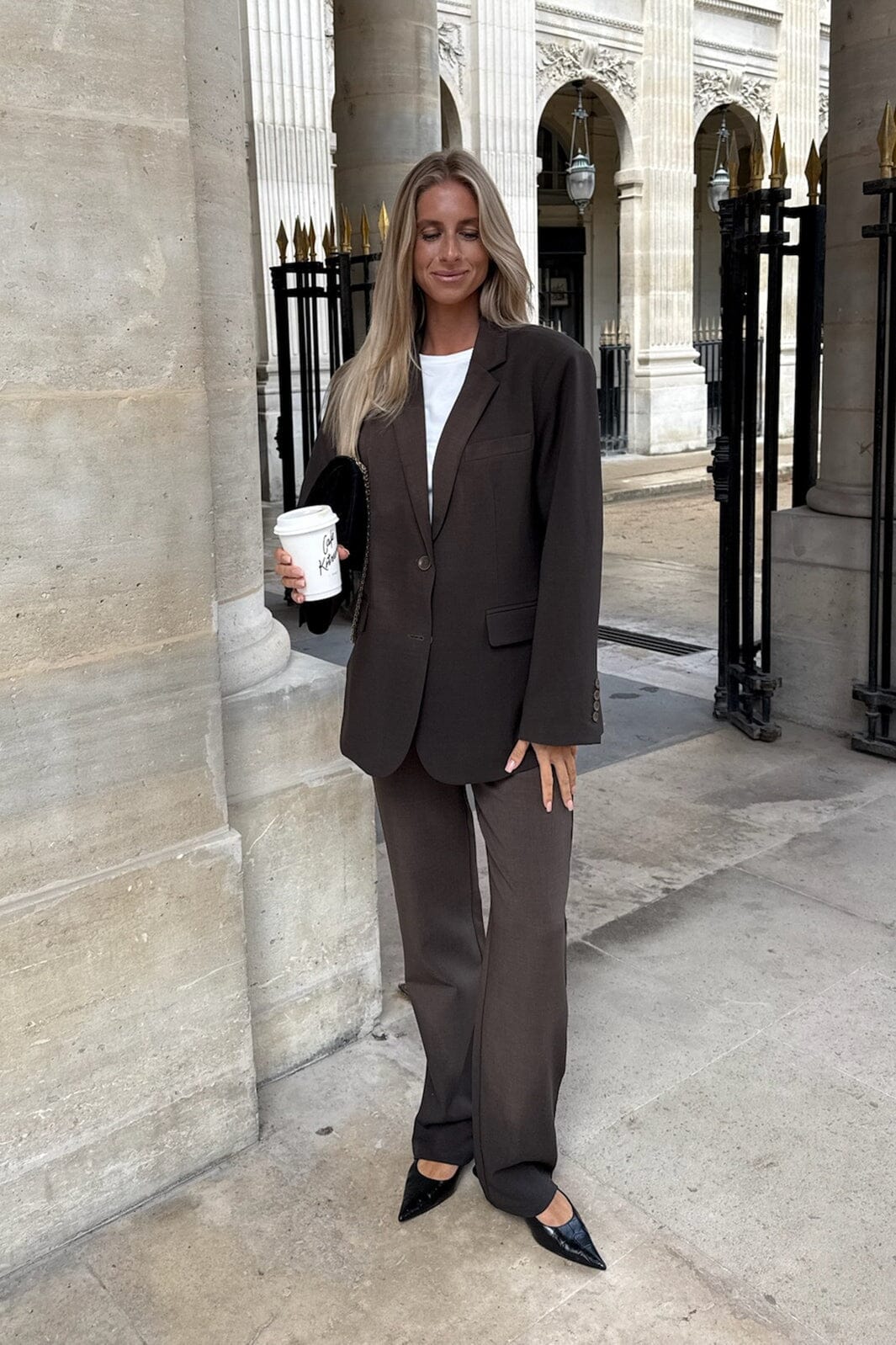 BYIC:n tummanruskea bleiseri V-kauluksella ja suoralinjaisella leikkauksella. Siinä on yksi nappi edessä, taskut molemmilla puolilla ja rintatasku vasemmalla puolella.